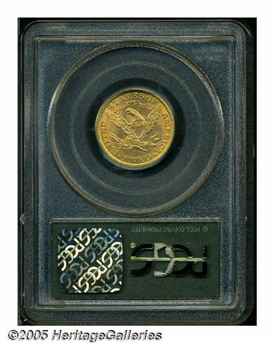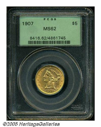 <B>1907<$5> MS62 PCGS.</B></I> A sharply struck peach-gold type coin with uncommonly clean fields for the grade. A moderate mark near the mouth is barely worthy of singular mention. Housed in a green label holder.