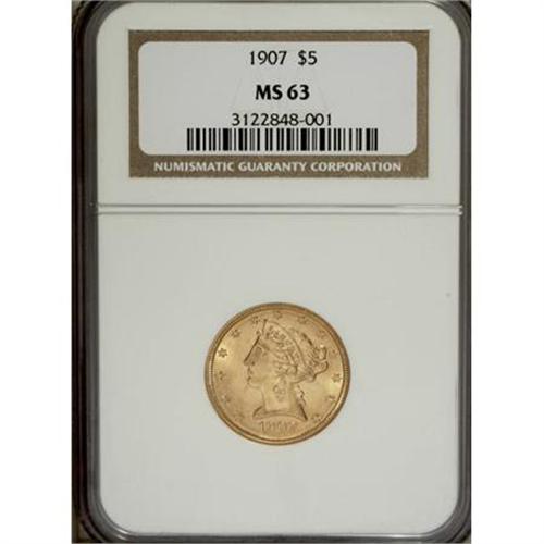 <B>1907 $5 MS63 NGC.</B></I> NGC Census: (1399/839). PCGS Population (1238/596). Mintage: 626,192. Numismedia Wsl. Price for NGC/PCGS coin in MS63: $925. (#8416)<BR><BR><B>Coin Engraver:</B> Christian Gobrecht<BR><BR><b>Shipping:</b> Coins & Currency (<a target="_blank" href="http://www.heritageauctions.com/common/shipping.php">view shipping information</a>)