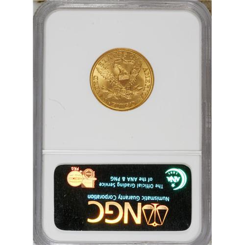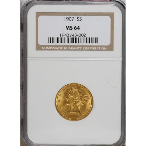 <B>1907 $5 MS64 NGC.</B></I> A lustrous and impressively clean yellow-gold and lime near-Gem that has the look of a higher grade. The strike is crisp, and the reverse is particularly beautiful.<BR><BR><b>Shipping:</b> Coins & Currency (<a target="_blank" href="http://www.heritageauctions.com/common/shipping.php">view shipping information</a>)