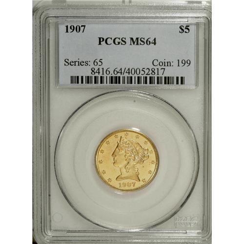<B>1907 $5 MS64 NGC.</B></I> A semi-prooflike example whose radiant fields display relatively few noticeable marks. The strike is assertive, and the portrait is well preserved.<BR><BR><b>Shipping:</b> Coins & Currency (<a target="_blank" href="http://www.heritageauctions.com/common/shipping.php">view shipping information</a>)