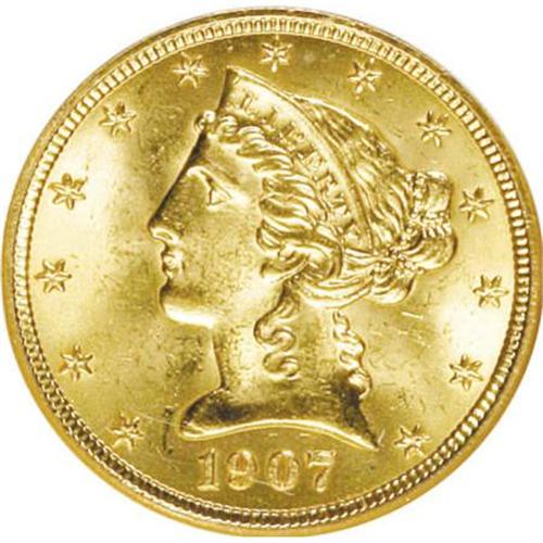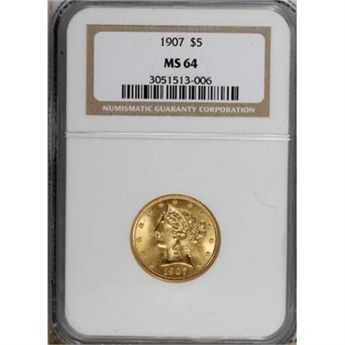 <B>1907 $5 MS64 NGC.</B></I> NGC Census: (644/167). PCGS Population (471/77). Mintage: 626,192. Numismedia Wsl. Price for NGC/PCGS coin in MS64: $1,380. (#8416)<BR><BR><B>Coin Engraver:</B> Christian Gobrecht<BR><BR><b>Shipping:</b> Coins & Currency (<a target="_blank" href="http://www.heritageauctions.com/common/shipping.php">view shipping information</a>)
