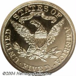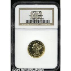 <B>1907<$5> PR67 Cameo NGC.</B></I> A needle-sharp Superb Gem with radiant pale gold devices and imposing deeply mirrored fields. Thorough examination under a loupe fails to reveal any remotely noticeable hairlines. A pair of tiny planchet flaws (as made) near the arrowheads are of mint origin and will provide pedigree markers for any future auction appearances of this magnificent specimen. The final year of proof Liberty Half Eagle production, although business strikes of the type were coined in Philadelphia dated 1908. Proofs can be identified by a bold diagonal die line (as made) west of the initial vertical stripe of the shield. As of (7/04), NGC has certified only two 1907 proof Half Eagles as PR67 Cameo, with none finer. NGC has not encapsulated any examples as Ultra Cameo, and among non-Cameos, the finest graded by that service is PR65. Hence, the present piece is tied with one other coin as the finest certified, since PCGS has not graded any at or above the PR67 level.<BR><I>From The John Michael Stuart Collection, Part Two.</B></I> <BR><BR><B>Important notice:</B> Heritage usually auctions material at the rate of 200-250 lots per hour. On some occasions eBay Live bid software or the Internet may not be able to keep up with the pace of the auction. We recommend placing a realistic absentee bid now as insurance to avoid disappointment. Occasionally the auctioneer may eliminate or reject an eBay Live bid, and the auctioneer may also reopen a lot after the close of the eBay live bidding (usually because we missed an audience bid), and may reject your bid even if it shows you as the winning bidder. By bidding via eBay Live, you agree that Heritage may award the lot to another bidder at its sole discretion under the circumstances described above or any other reasonable circumstances. Since eBay bids are not shown to us until we open the lot on the floor, we treat those bids just like floor bids. In most cases the floor responds before the eBay bid is presented to us, due to Internet lag time, so for consistency we have made it a policy that floor bids are always considered first over tie eBay live bids. Also please note that all Heritage lots purchased through eBay Live carry a 20% Buyer's Premium. Please make sure you read the Terms and Conditions before you bid. </span></font></tr></table></td></tr></table>