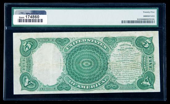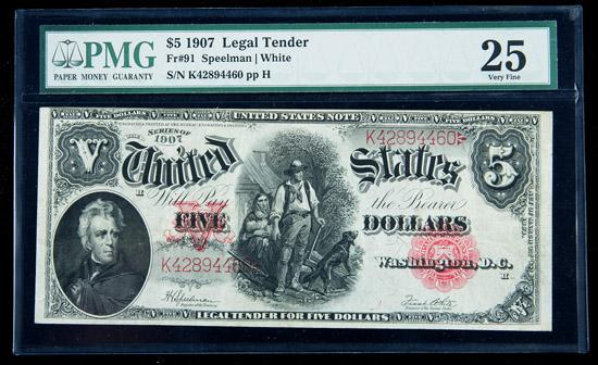 1907, $5 United States Note. PMG Very Fine 25. . Fr-91. This lovely mid-grade "Pioneer Family" $5 appears fully original and problem-free for the grade through the holder.