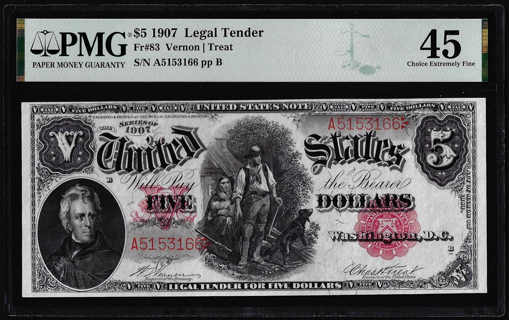 One 1907 $5 Woodchopper Legal Tender Note Fr.83 PMG Choice Extremely Fine 45. PMG Certified.
