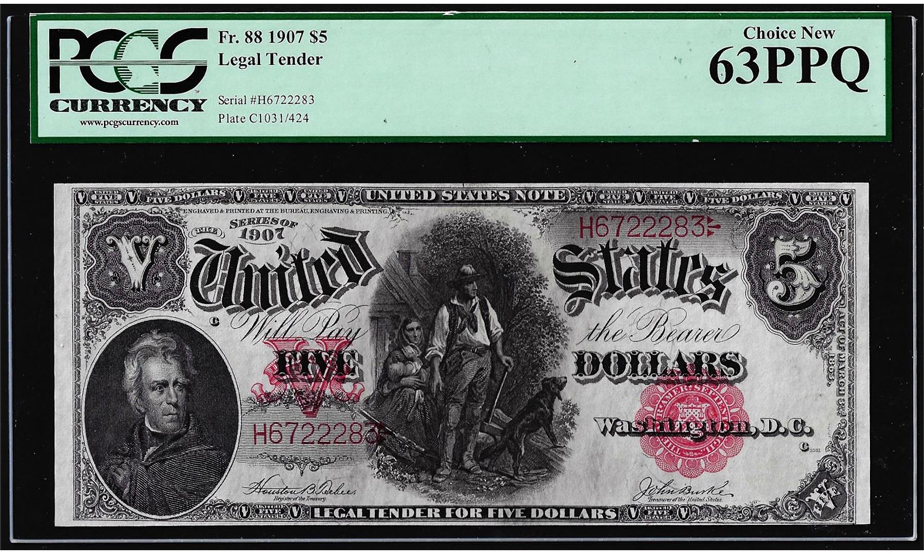 One 1907 $5 Woodchopper Legal Tender Note Fr.88 PCGS Choice New 63PPQ. PCGS Graded.