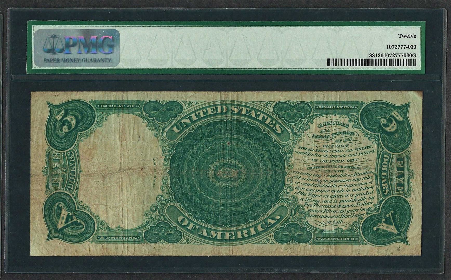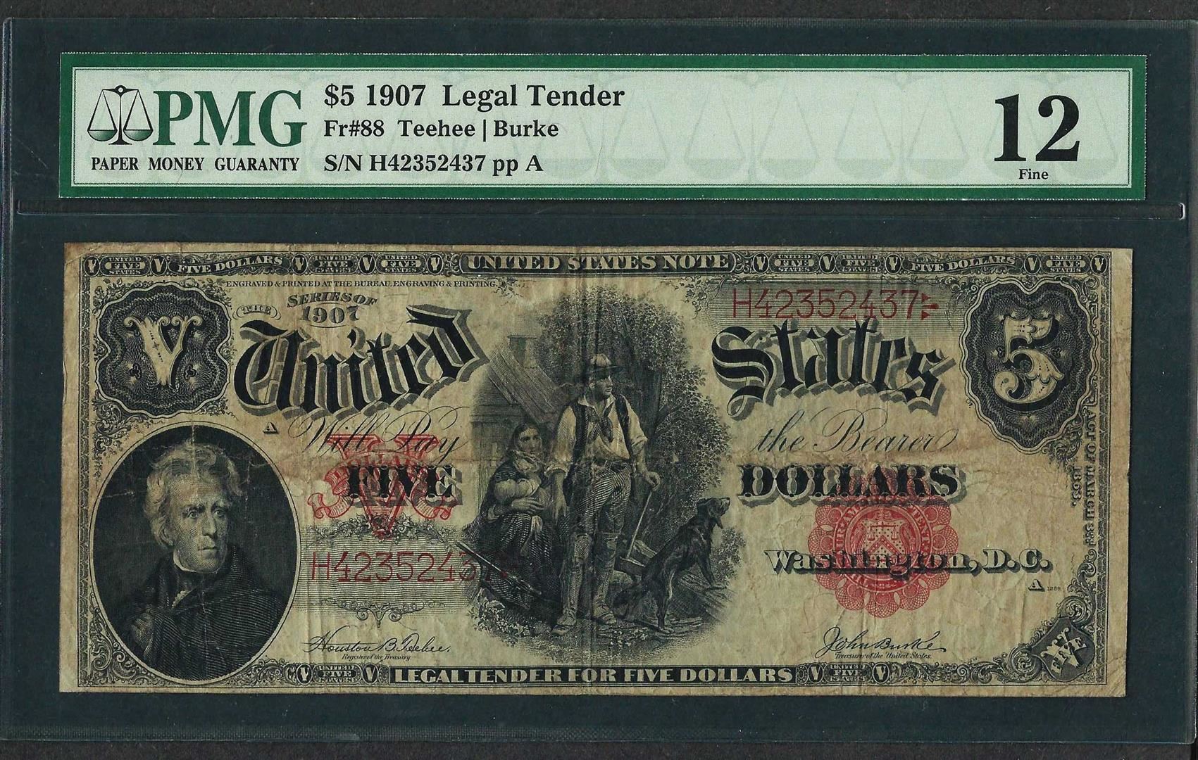 One 1907 $5 Woodchopper Legal Tender Note Fr.88 PMG Fine 12. PMG Certified.
