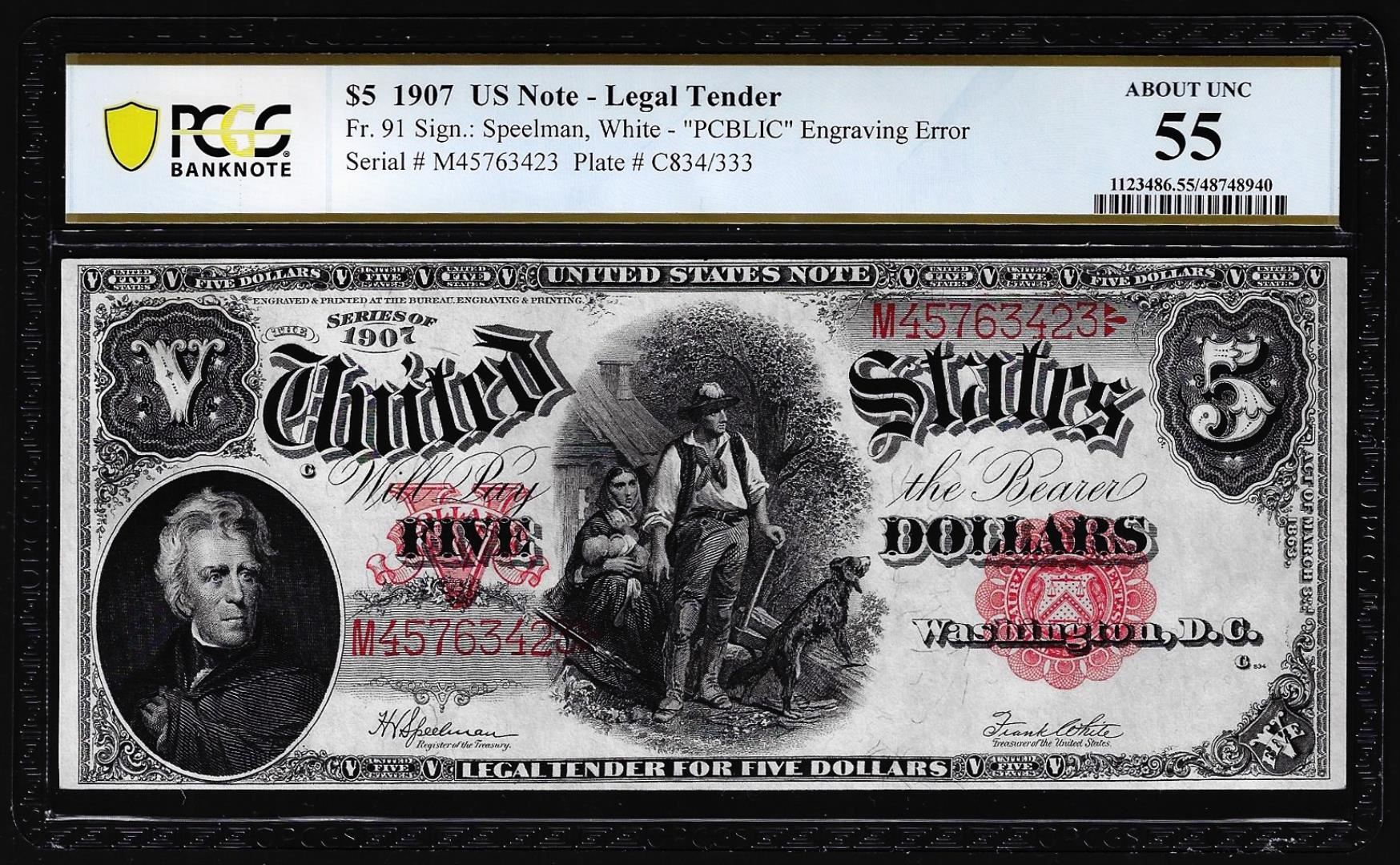 One 1907 $5 Woodchopper Legal Tender Note Fr.91 PCGS About Uncirculated 55. PCGS Graded.