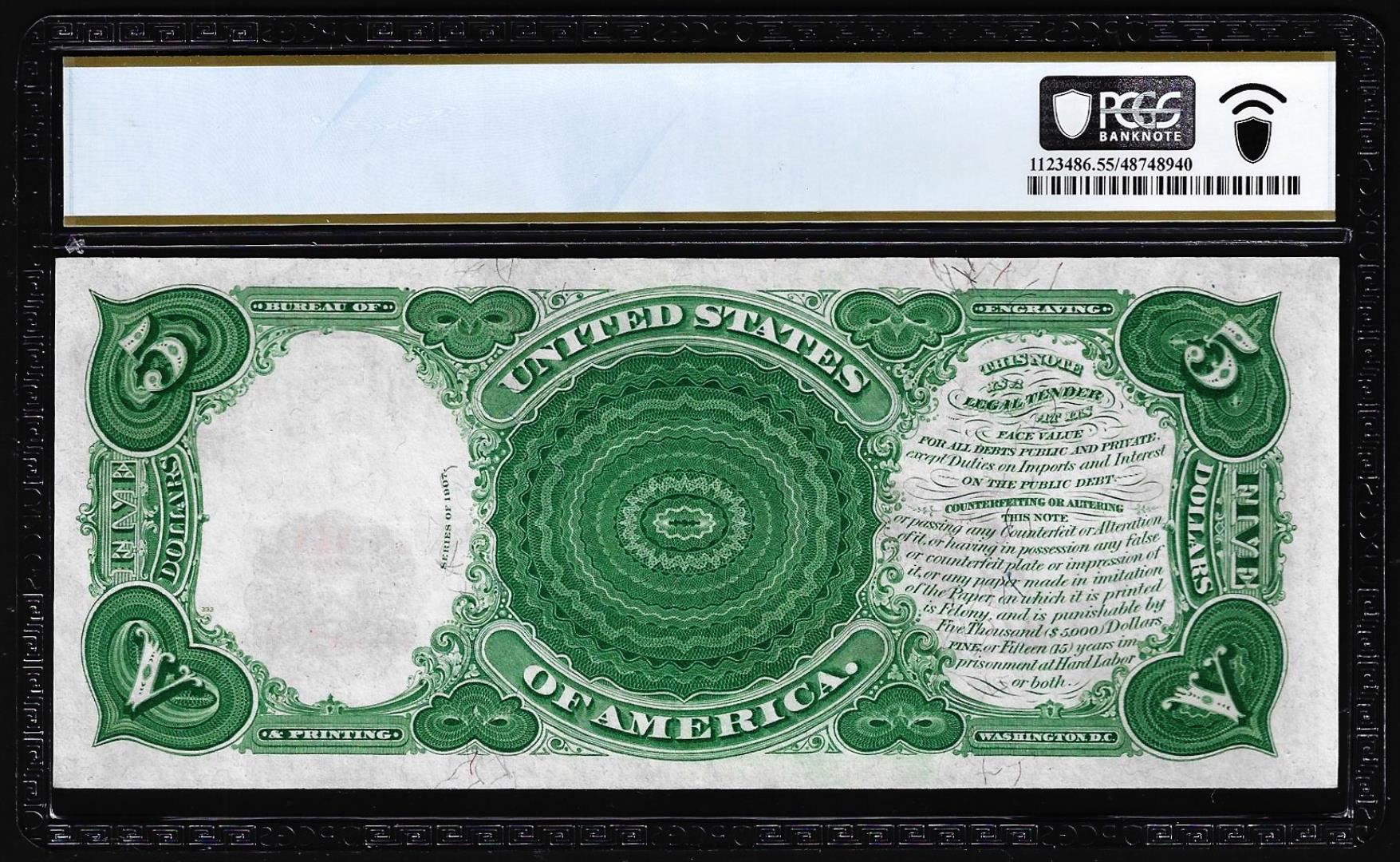 1907 $5 Woodchopper Legal Tender Note Fr.91 PCGS About Uncirculated 55