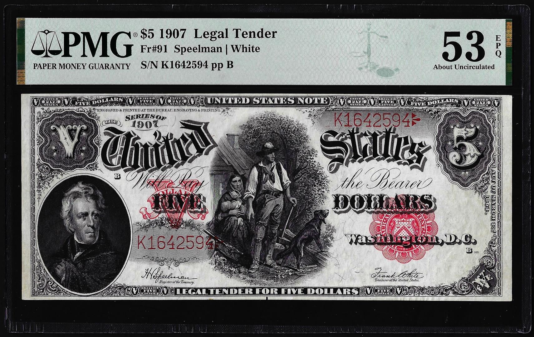 One 1907 $5 Woodchopper Legal Tender Note Fr.91 PMG About Uncirculated 53EPQ. PMG Certified.