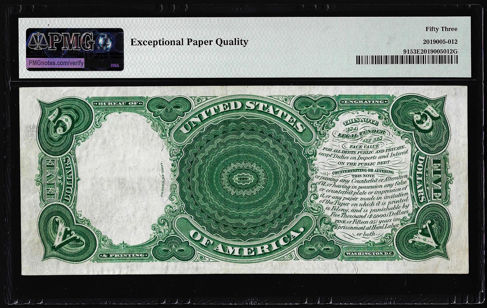 1907 $5 Woodchopper Legal Tender Note Fr.91 PMG About Uncirculated 53EPQ