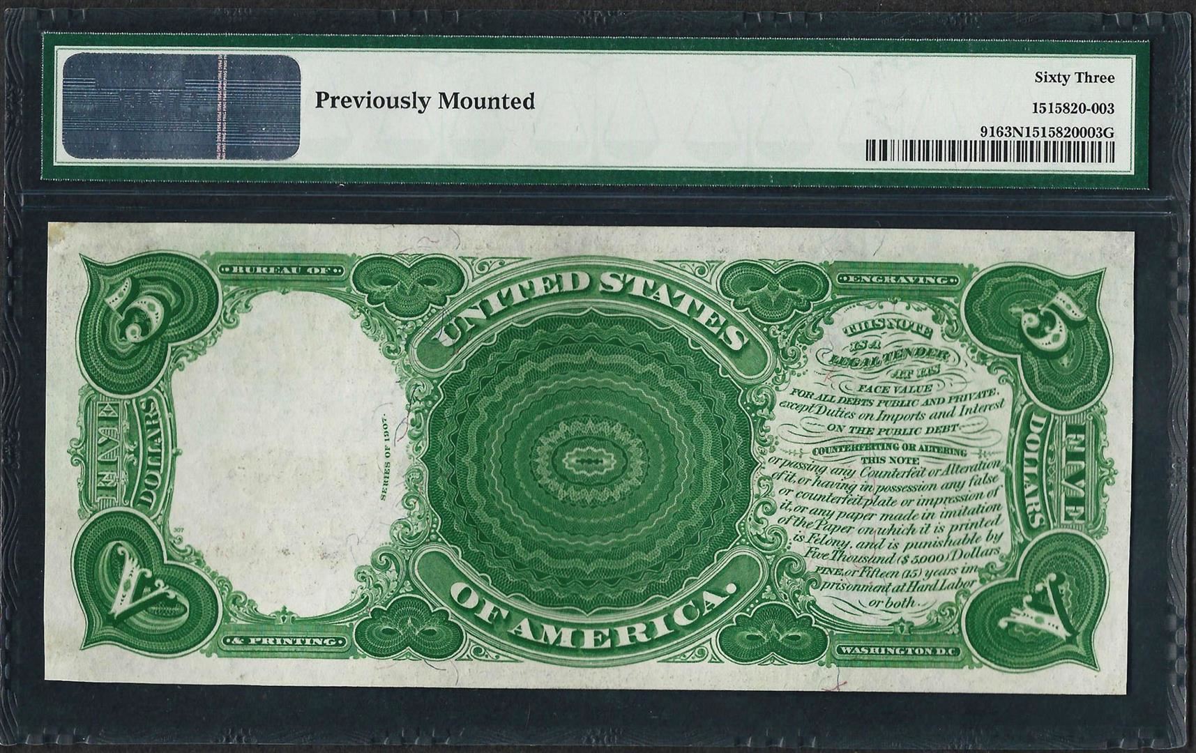 1907 $5 Woodchopper Legal Tender Note Fr.91 PMG Choice Uncirculated 63 Net