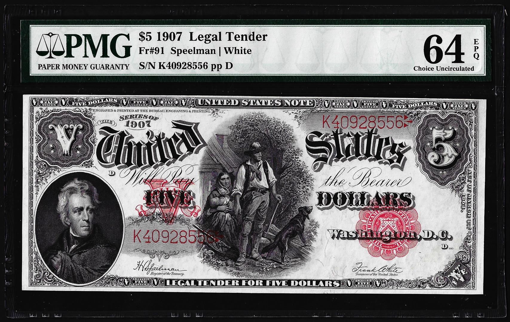 One 1907 $5 Woodchopper Legal Tender Note Fr.91 PMG Choice Uncirculated 64EPQ. PMG Certified.
