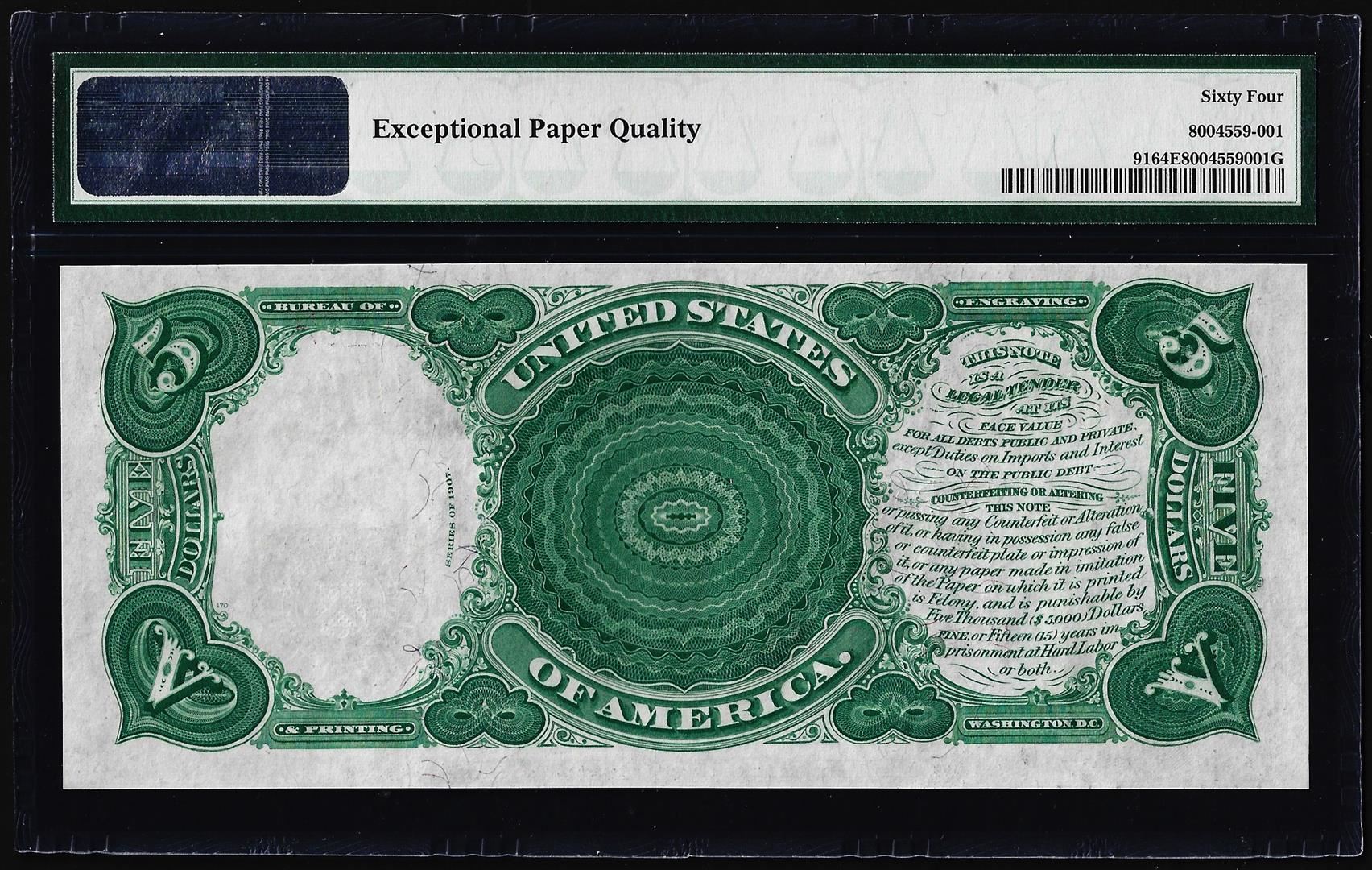 One 1907 $5 Woodchopper Legal Tender Note Fr.91 PMG Choice Uncirculated 64EPQ. PMG Certified.