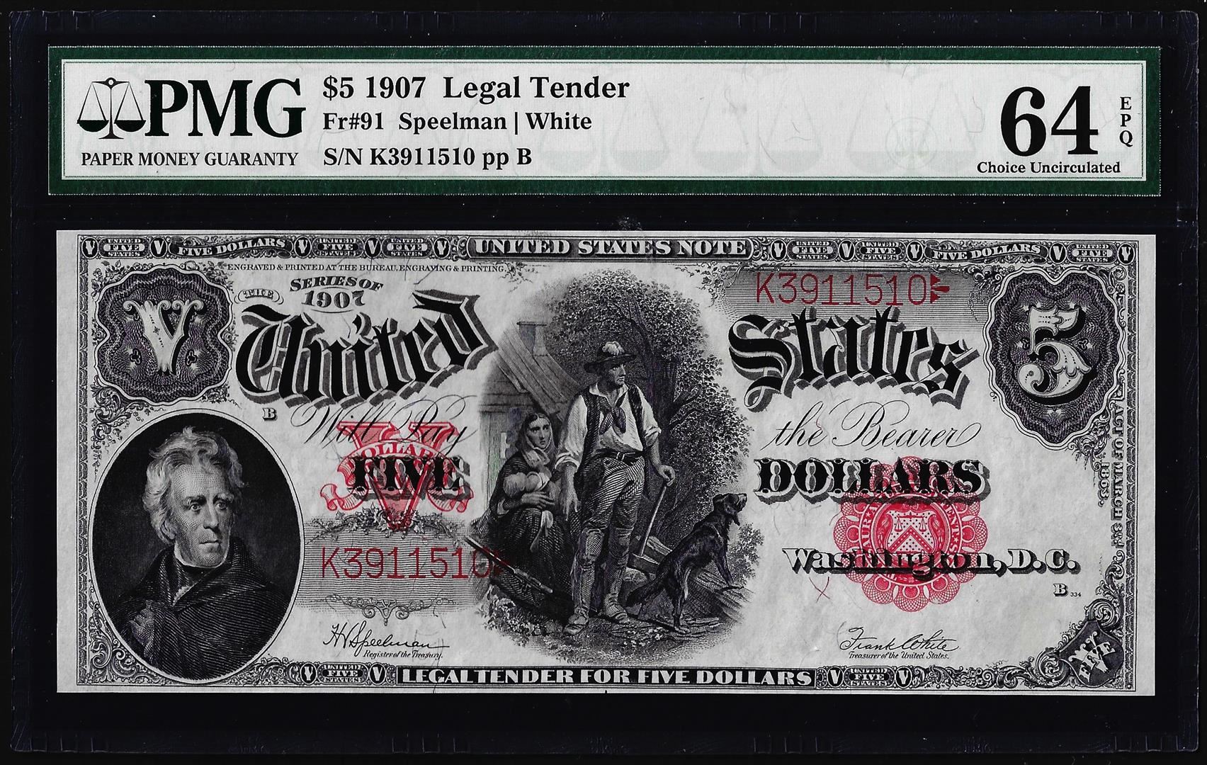 One 1907 $5 Woodchopper Legal Tender Note Fr.91 PMG Choice Uncirculated 64EPQ. PMG Certified.