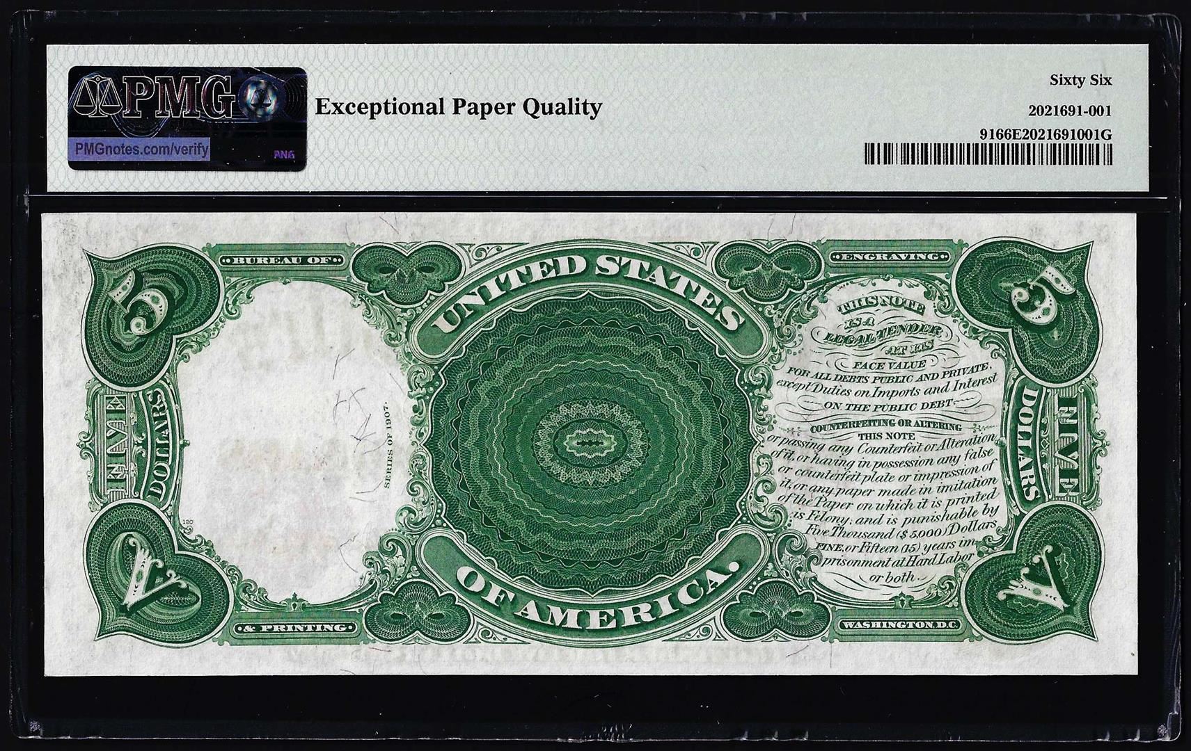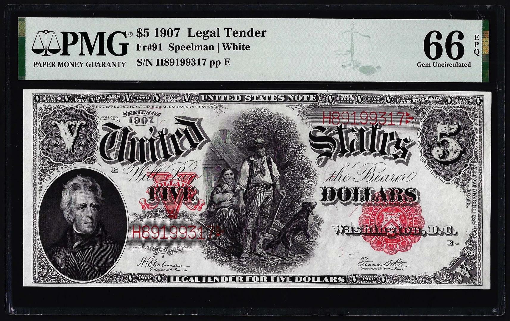 One 1907 $5 Woodchopper Legal Tender Note Fr.91 PMG Gem Uncirculated 66EPQ. PMG Certified.