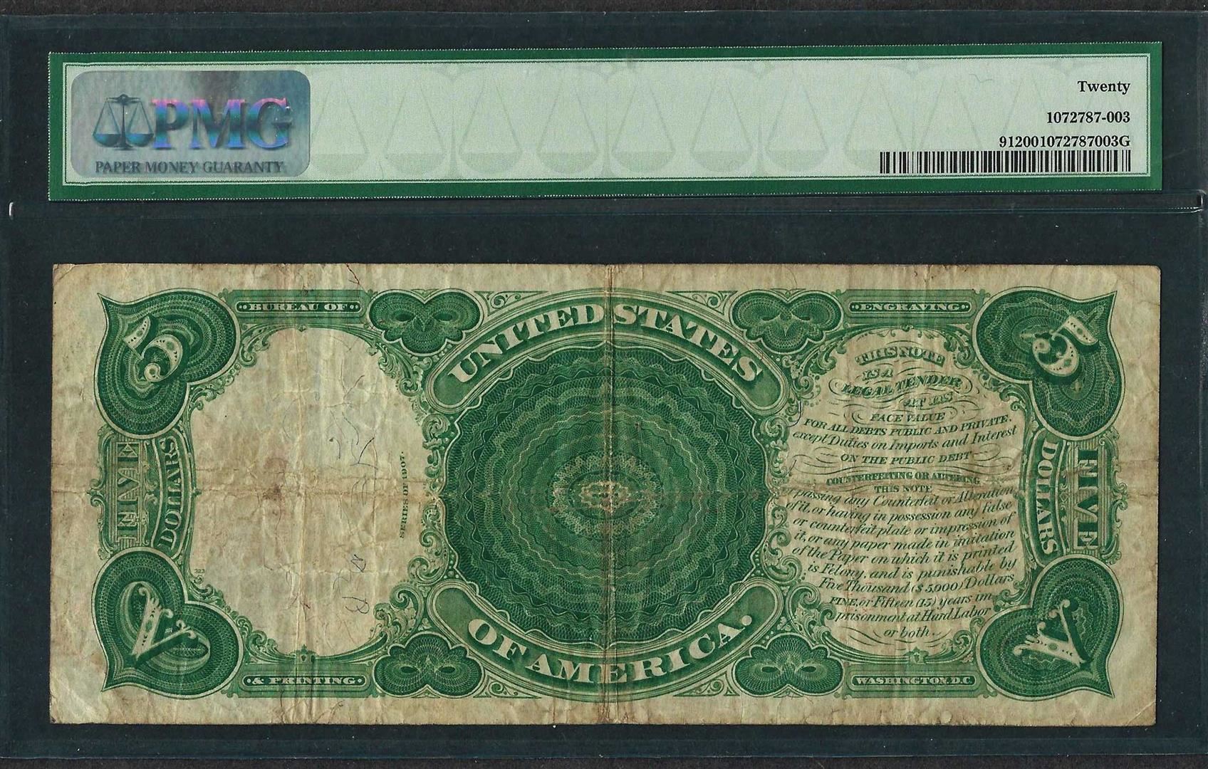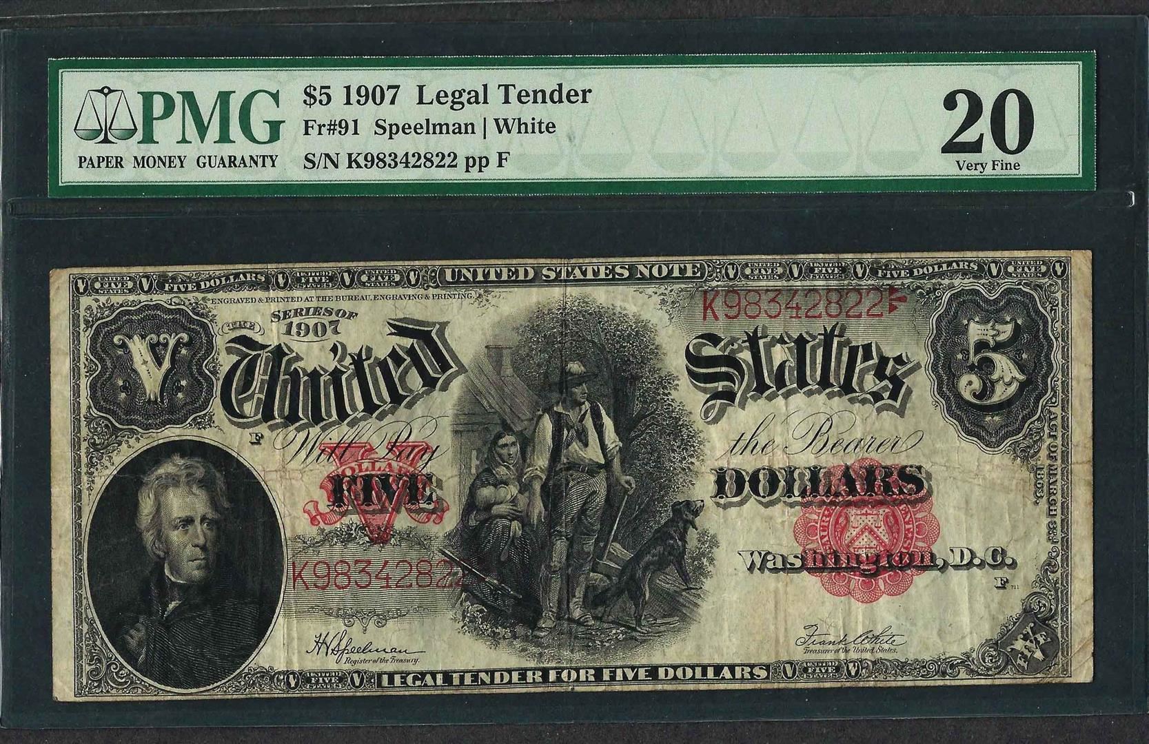 One 1907 $5 Woodchopper Legal Tender Note Fr.91 PMG Very Fine 20. PMG Certified.