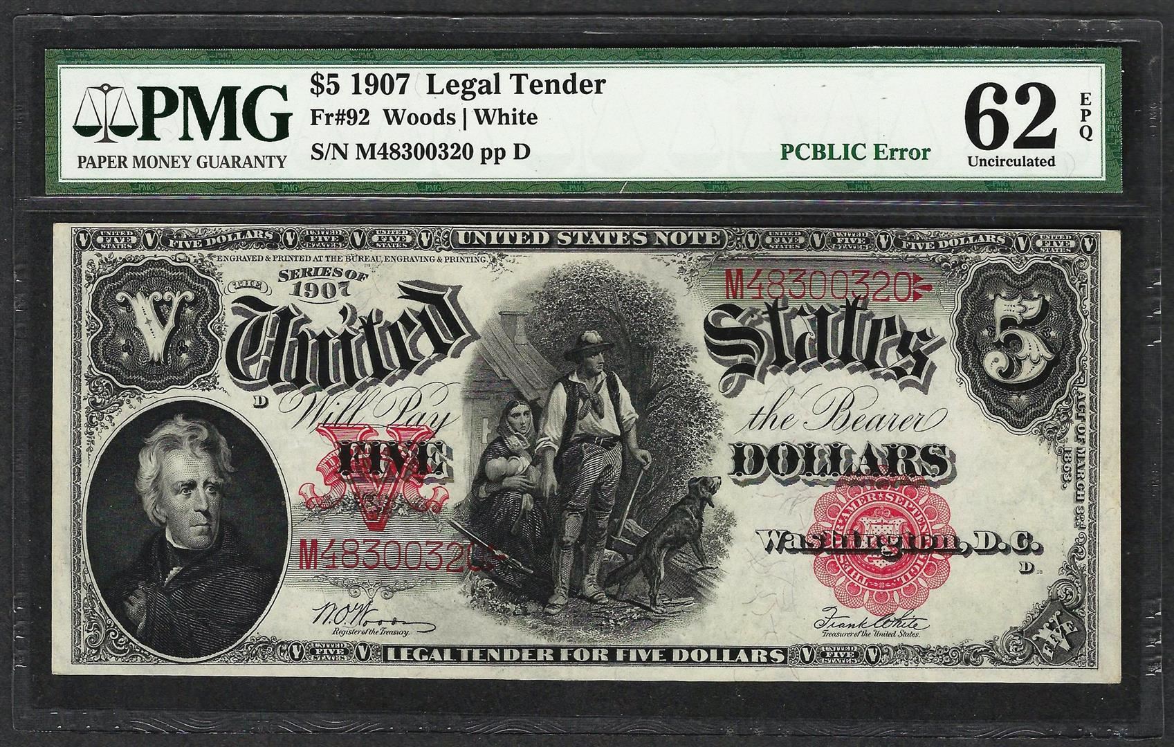 One 1907 $5 Woodchopper Legal Tender Note Fr.92 PCBLIC Error PMG Uncirculated 62EPQ. PMG Certified.