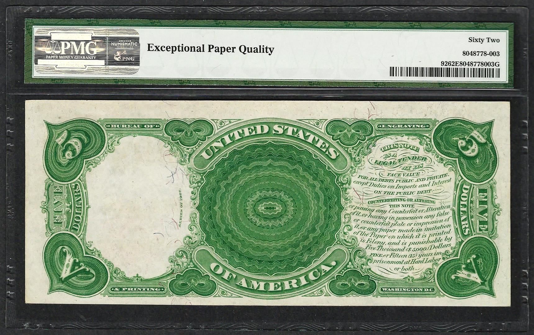 1907 $5 Woodchopper Legal Tender Note Fr.92 PCBLIC Error PMG Uncirculated 62EPQ