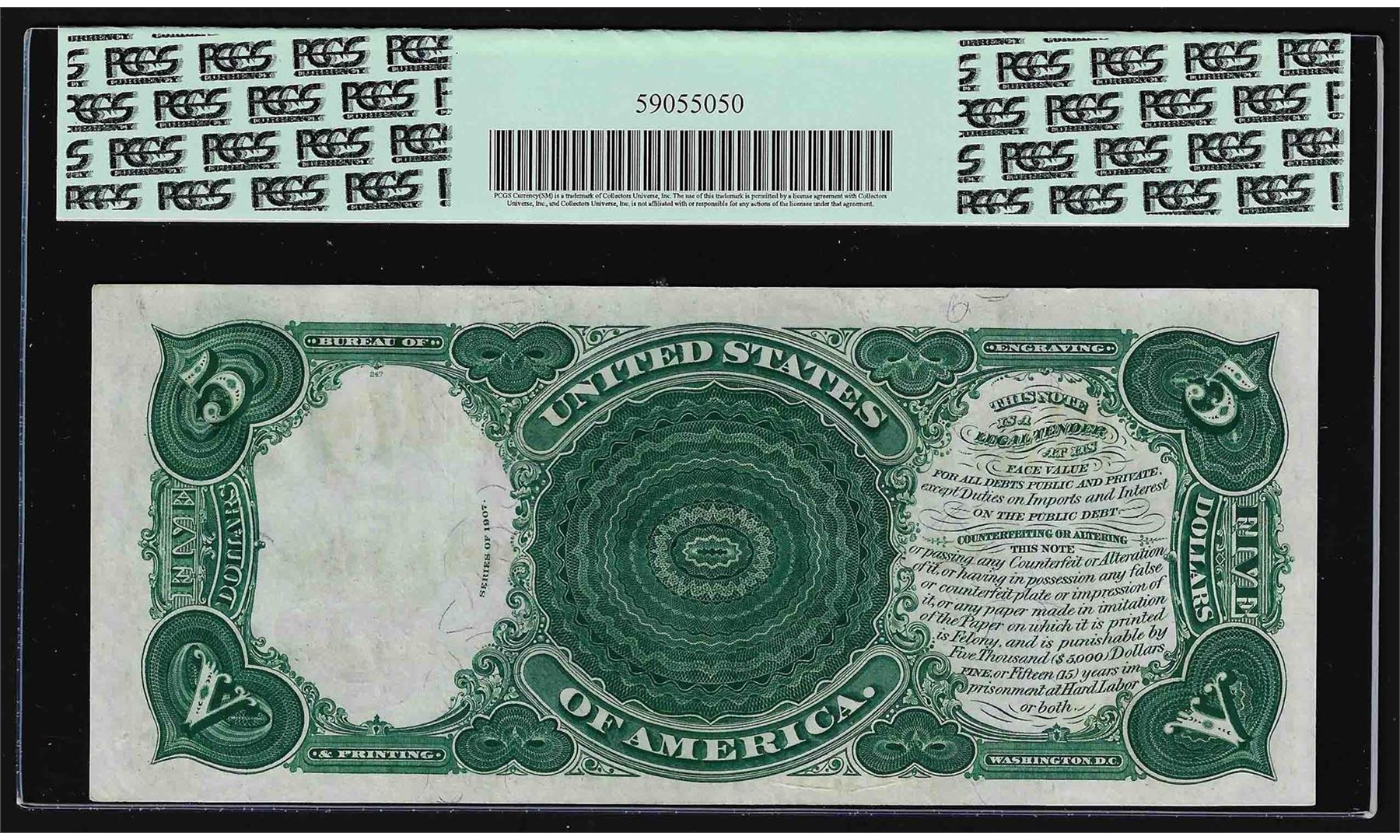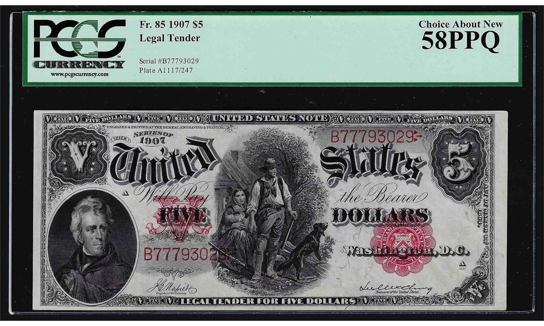 One 1907 $5 Woodchopper Legal Tender Note PCGS Choice About New 58PPQ. PCGS Graded.