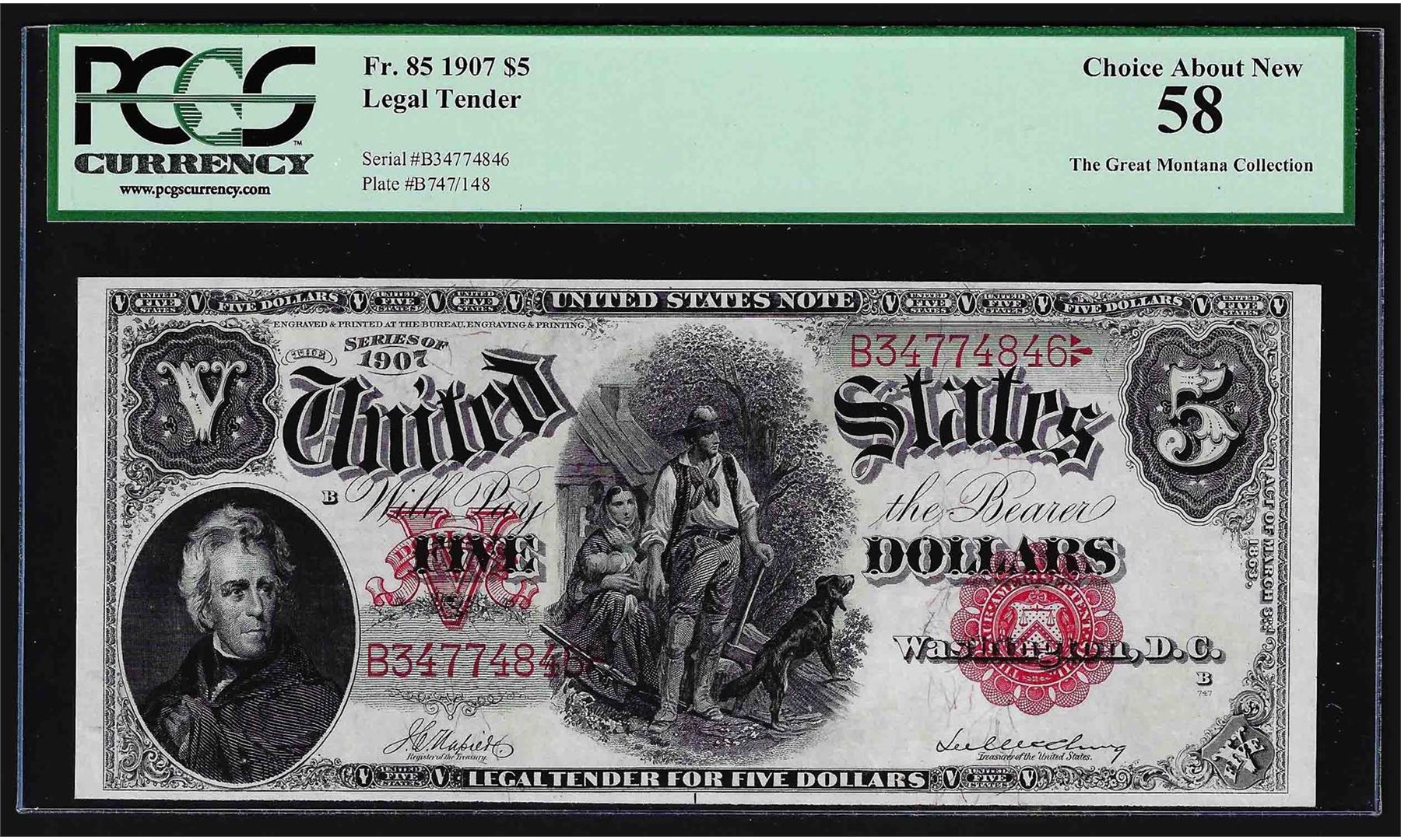 One 1907 $5 Woodchopper Legal Tender Note PCGS Choice About New 58. PCGS Graded.