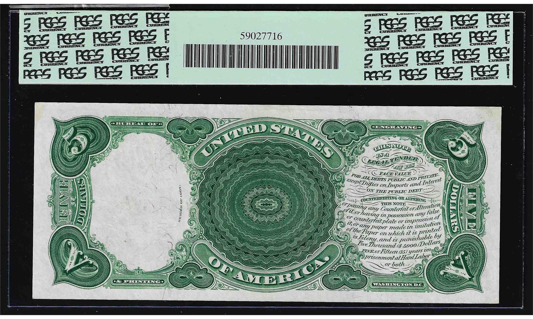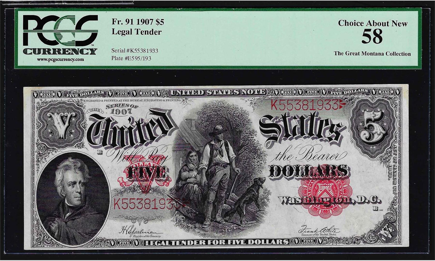 One 1907 $5 Woodchopper Legal Tender Note PCGS Choice About New 58. PCGS Graded.