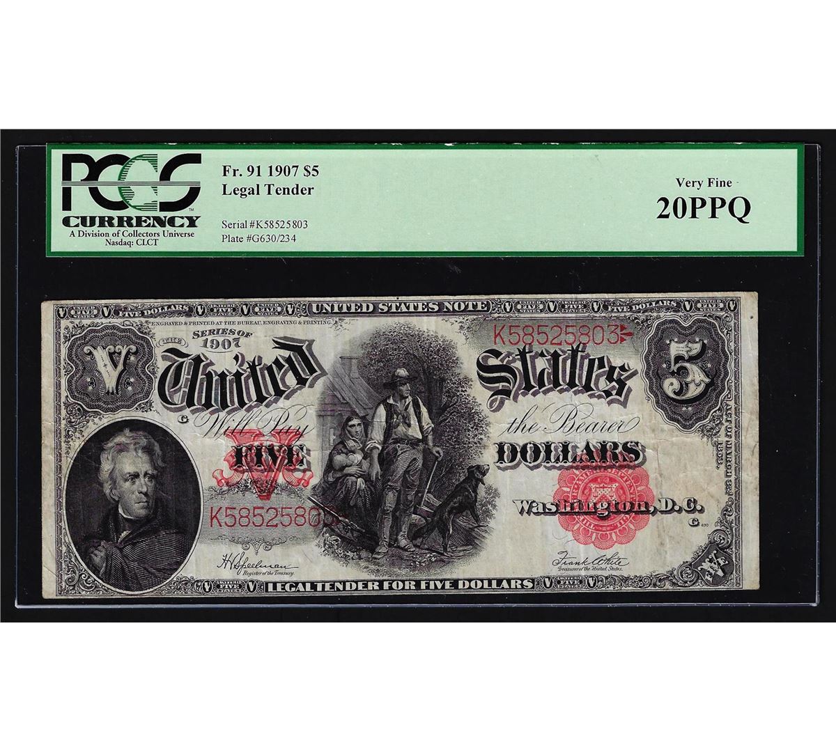 One 1907 $5 Woodchopper Legal Tender Note PCGS VF 20PPQ. PCGS Graded.
