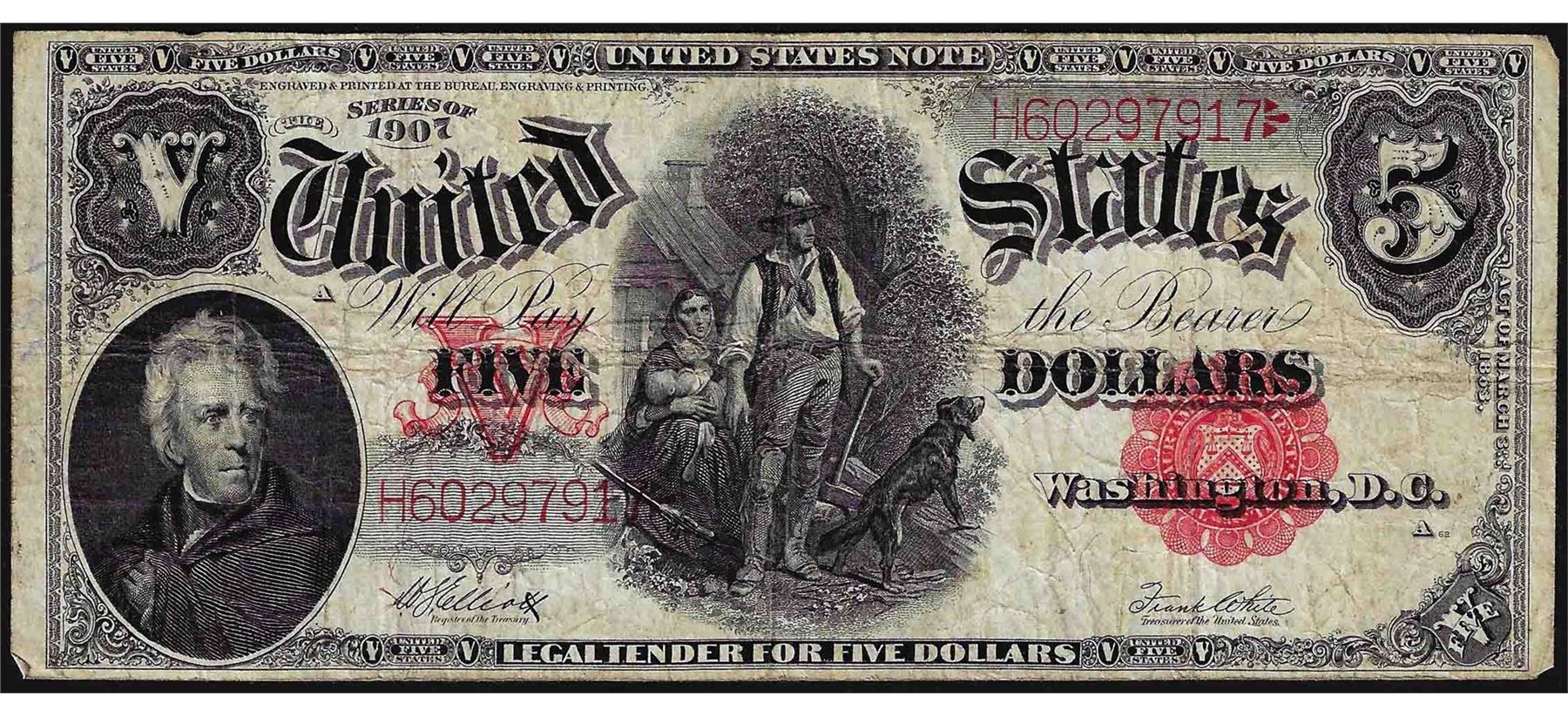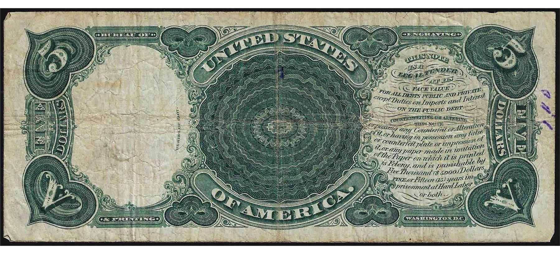 One 1907 $5 Woodchopper Legal Tender Note.