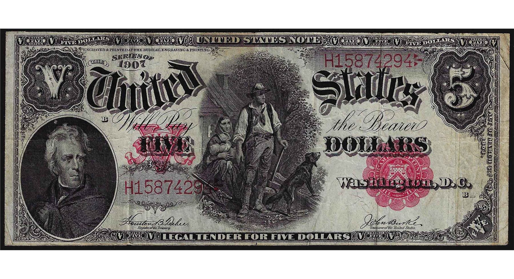 One 1907 $5 Woodchopper Legal Tender Note.