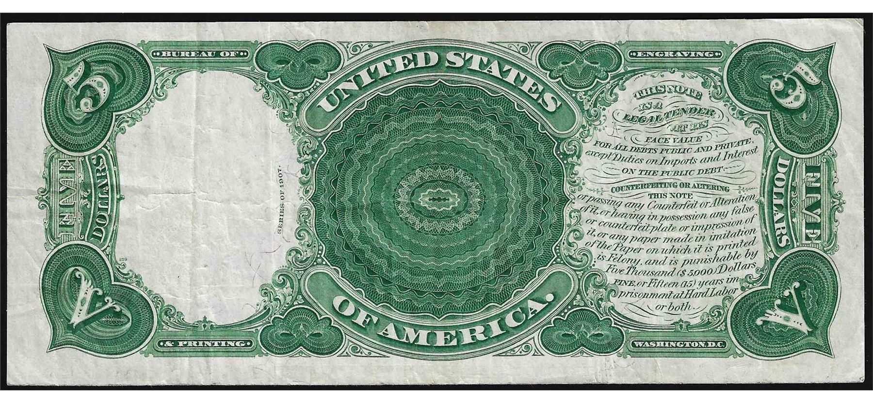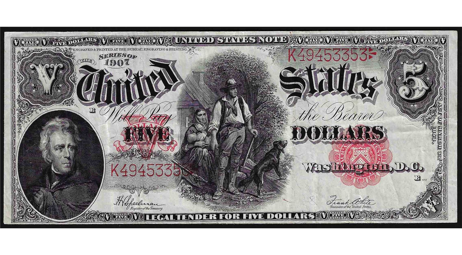 One 1907 $5 Woodchopper Legal Tender Note.