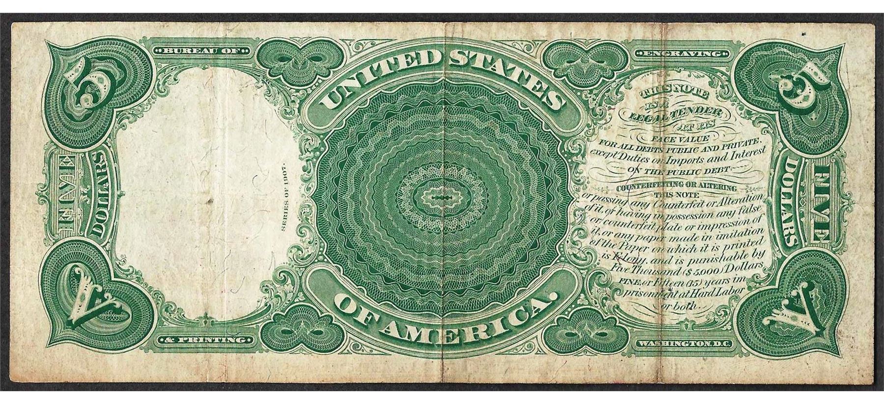 One 1907 $5 Woodchopper Legal Tender Note.