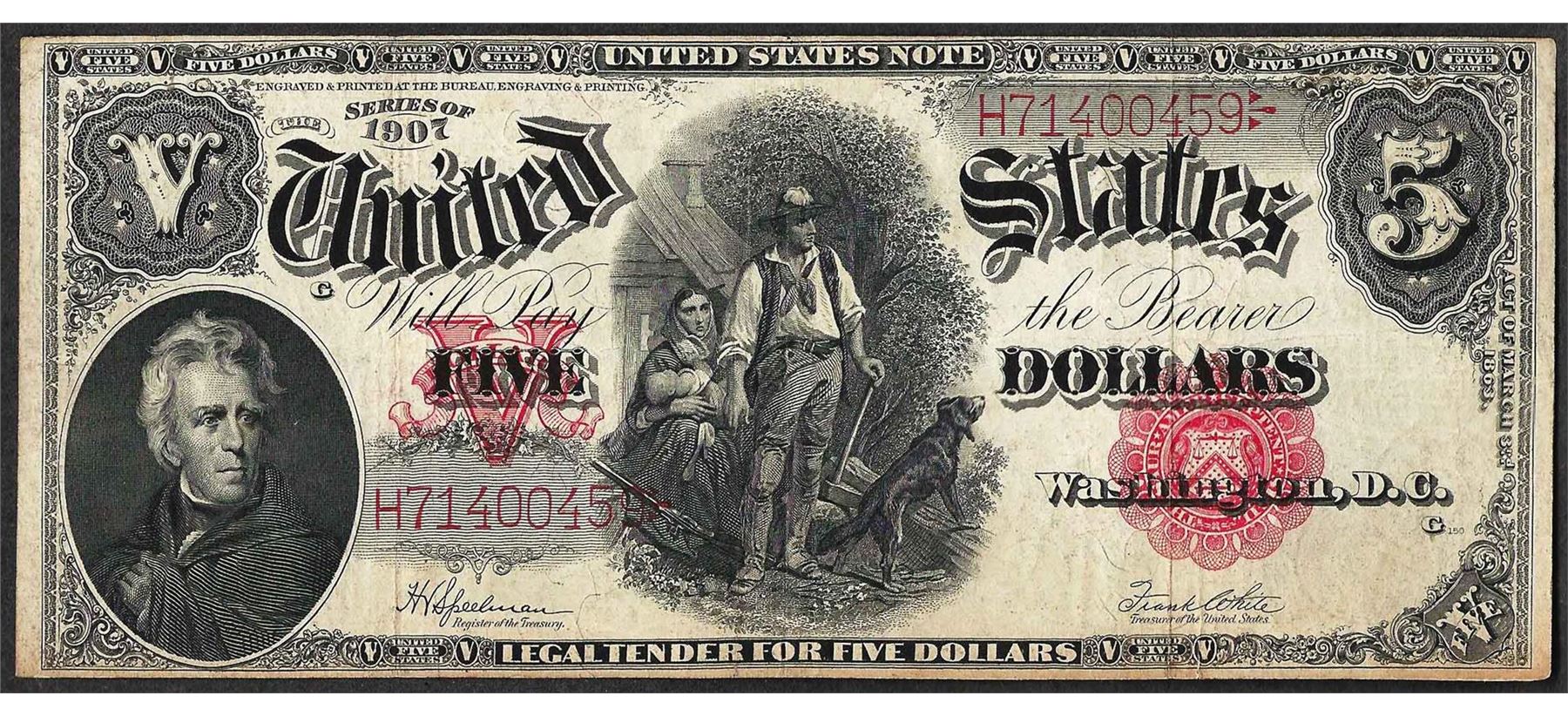 One 1907 $5 Woodchopper Legal Tender Note.