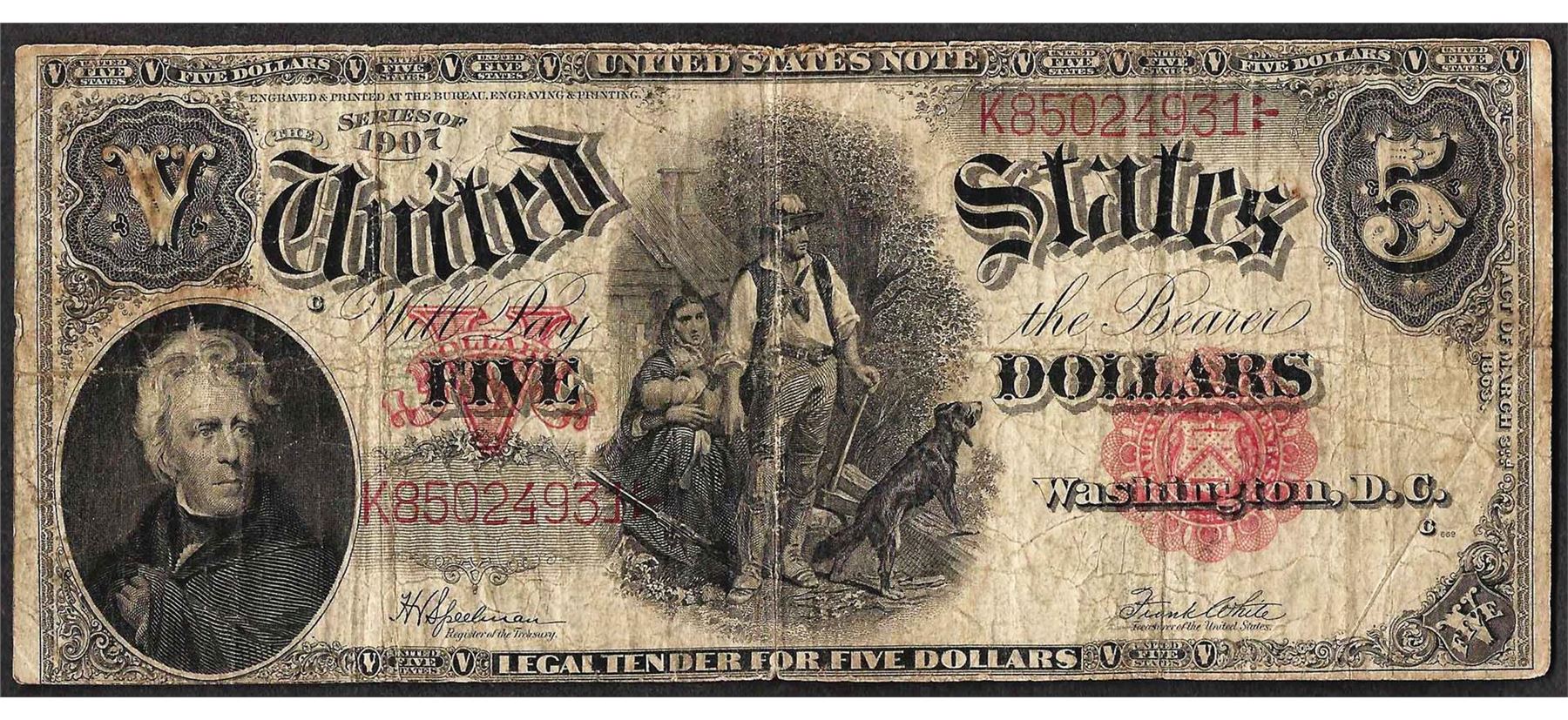 One 1907 $5 Woodchopper Legal Tender Note.