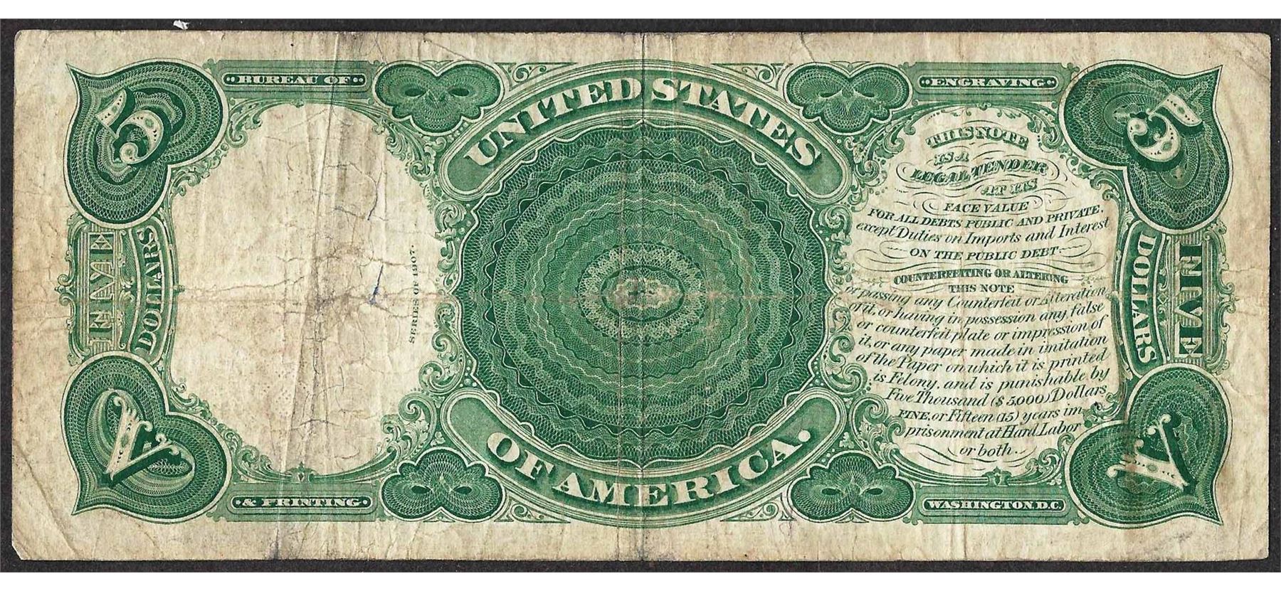 One 1907 $5 Woodchopper Legal Tender Note.