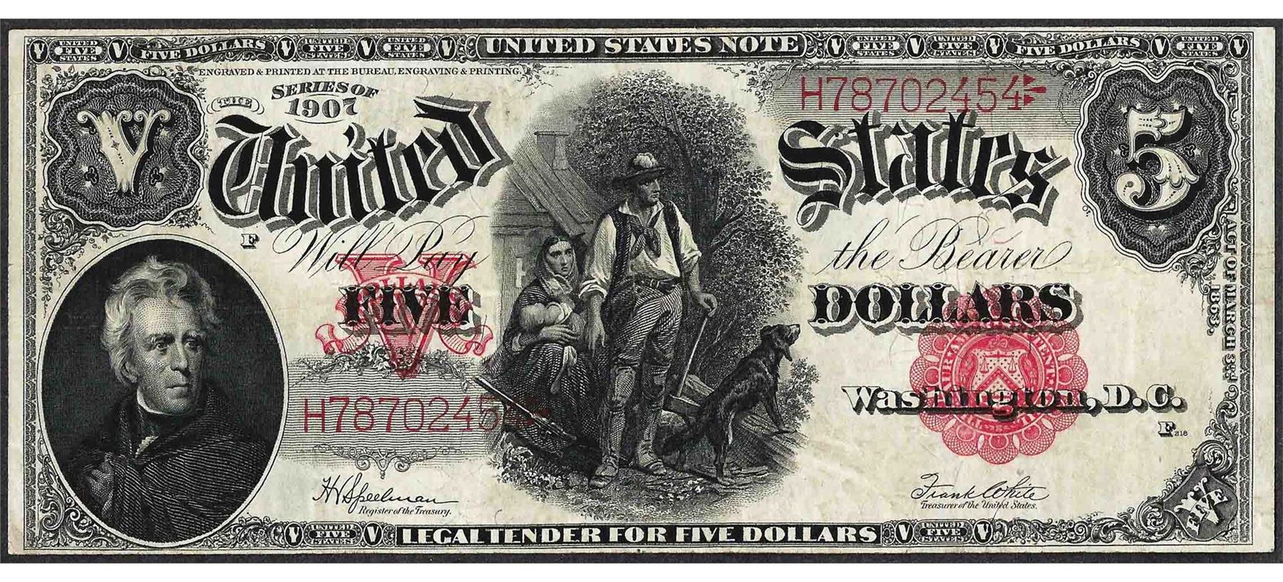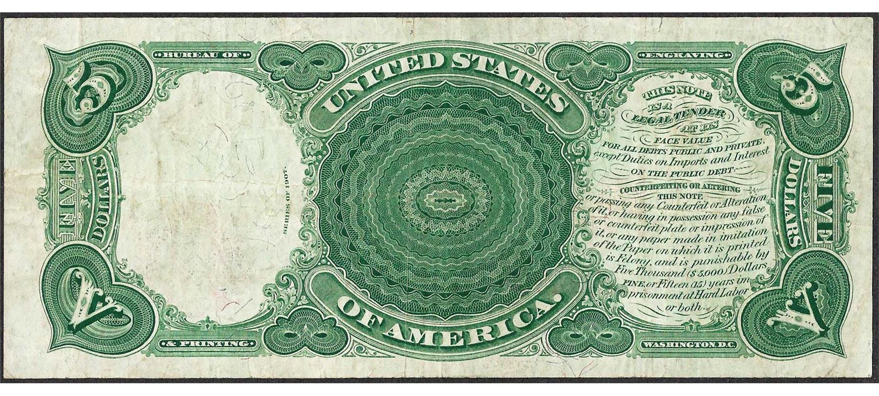 One 1907 $5 Woodchopper Legal Tender Note.