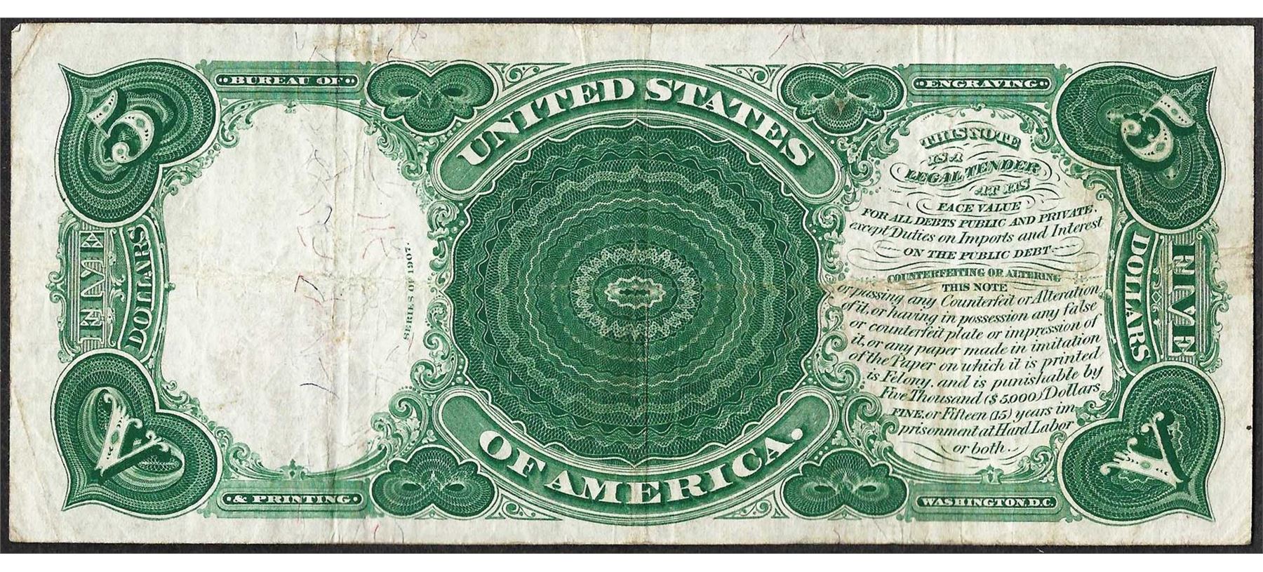 One 1907 $5 Woodchopper Legal Tender Note.