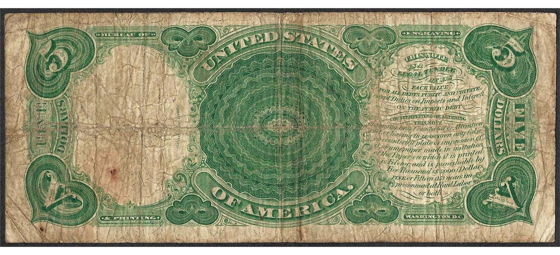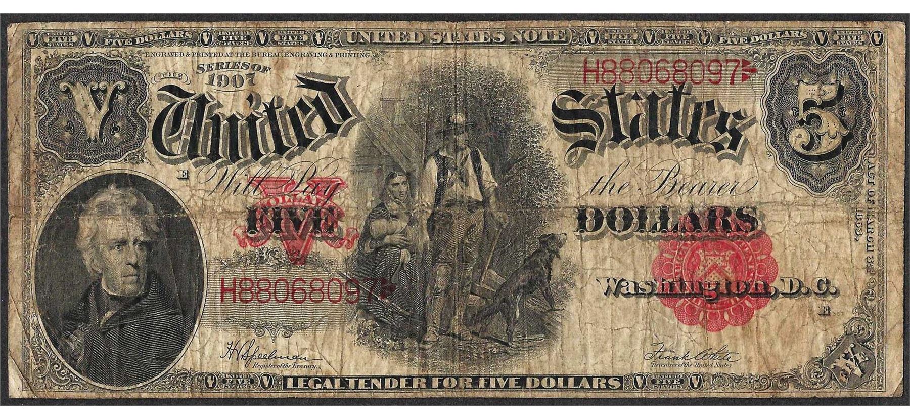 One 1907 $5 Woodchopper Legal Tender Note.
