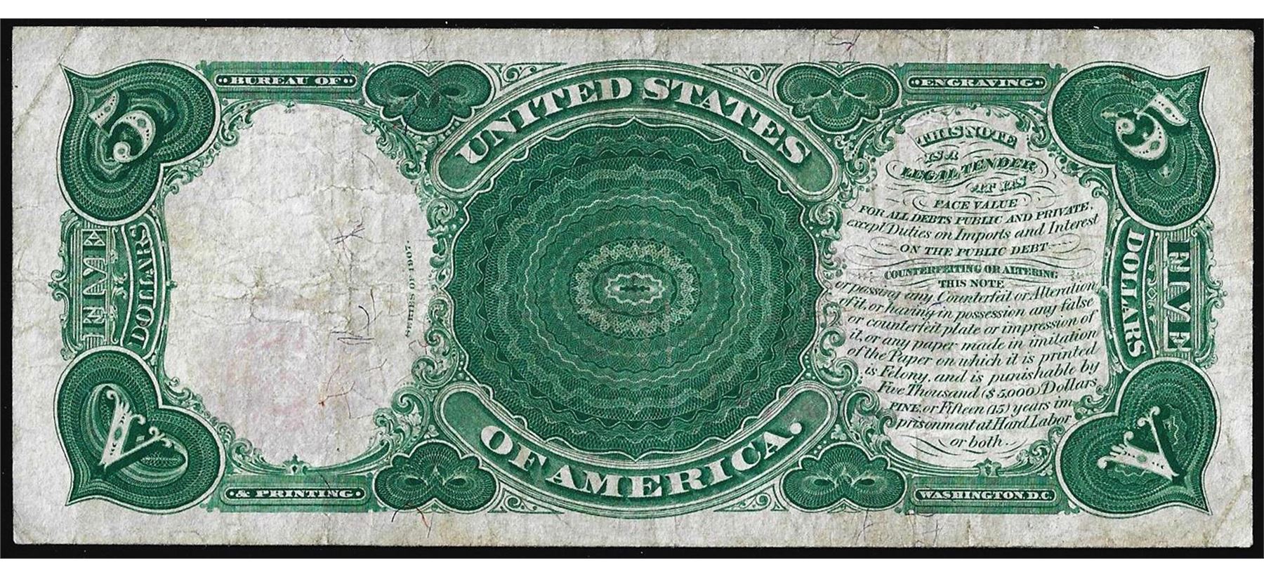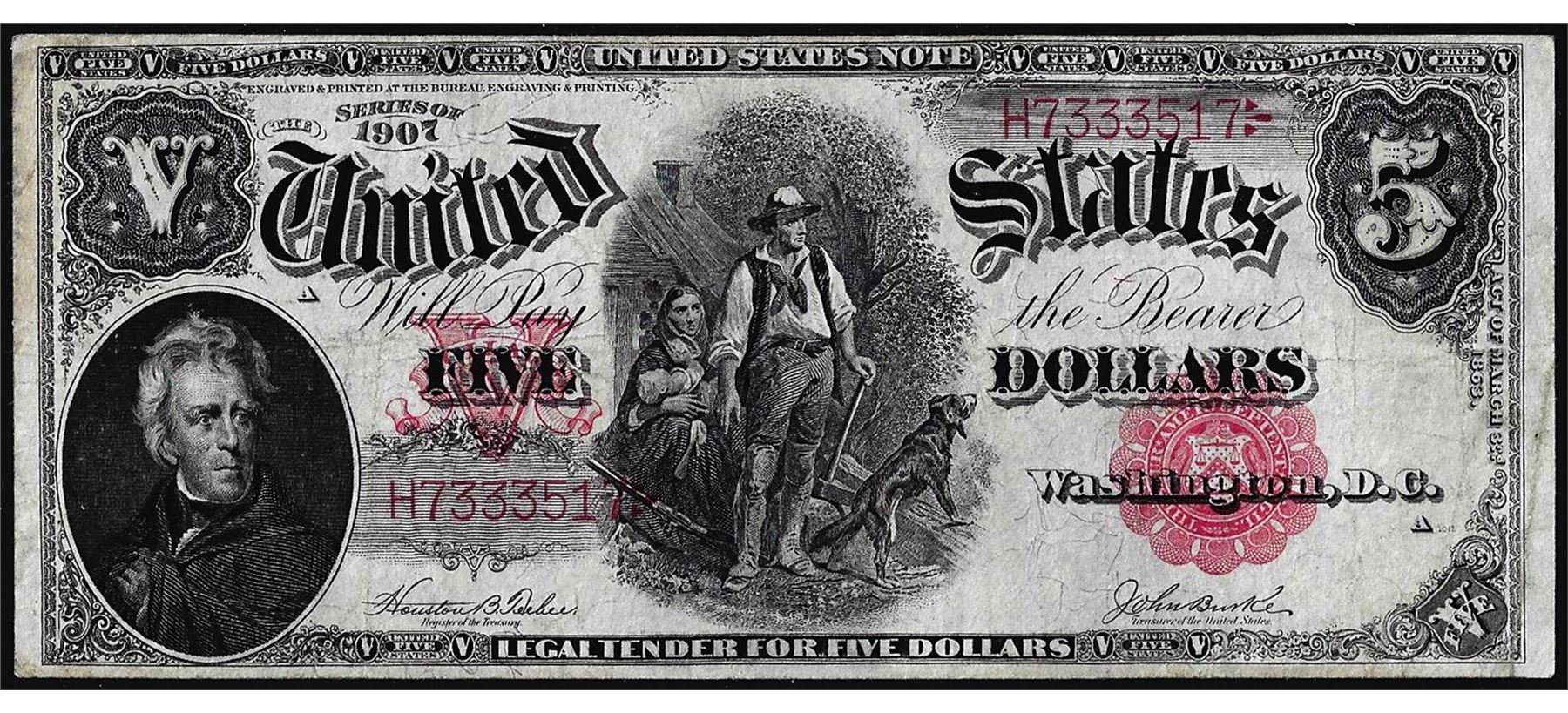 One 1907 $5 Woodchopper Legal Tender Note.