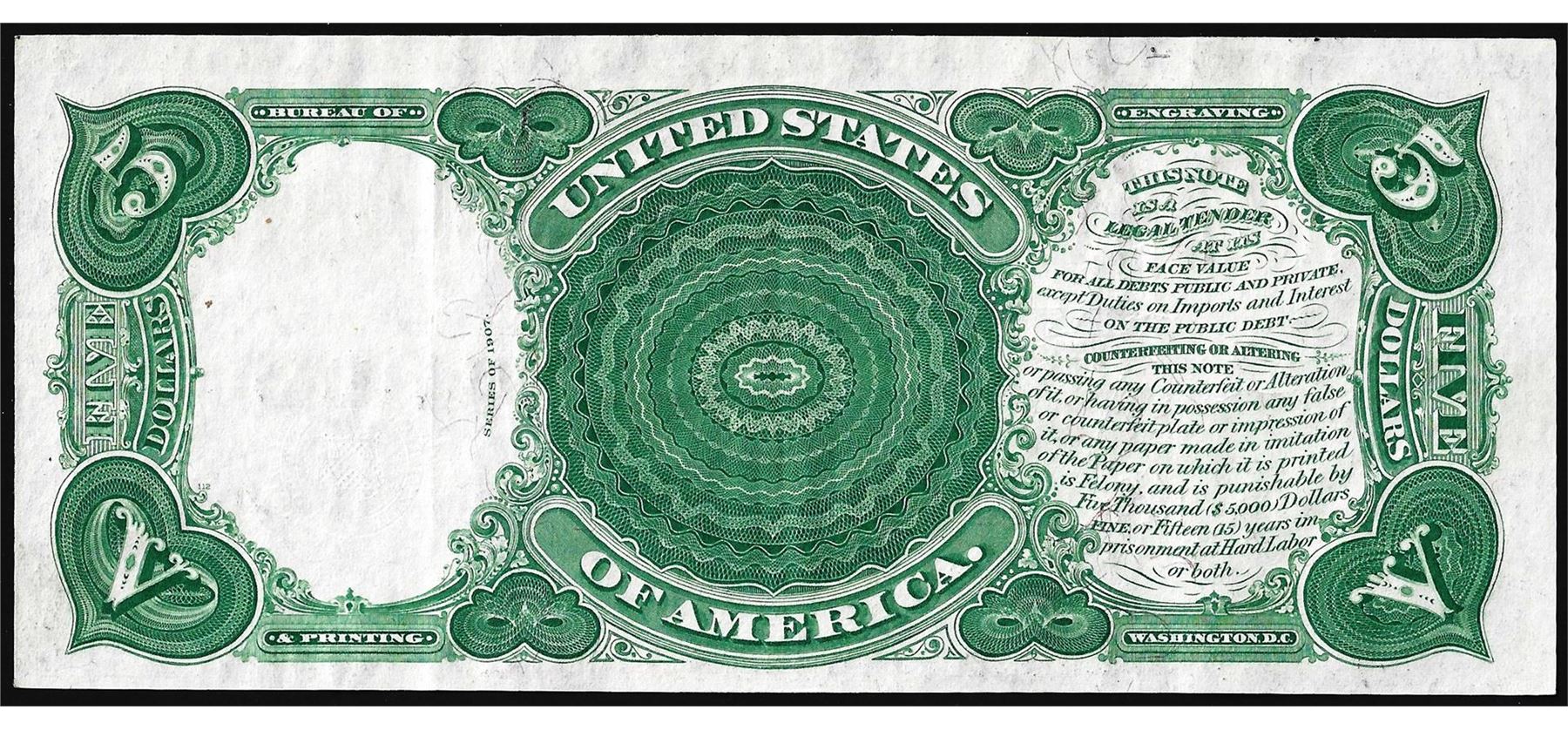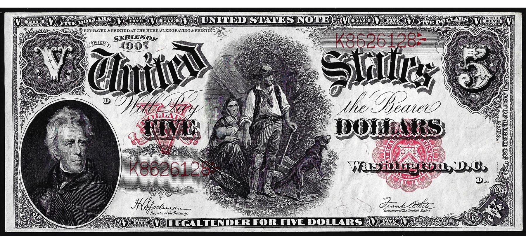 One 1907 $5 Woodchopper Legal Tender Note.