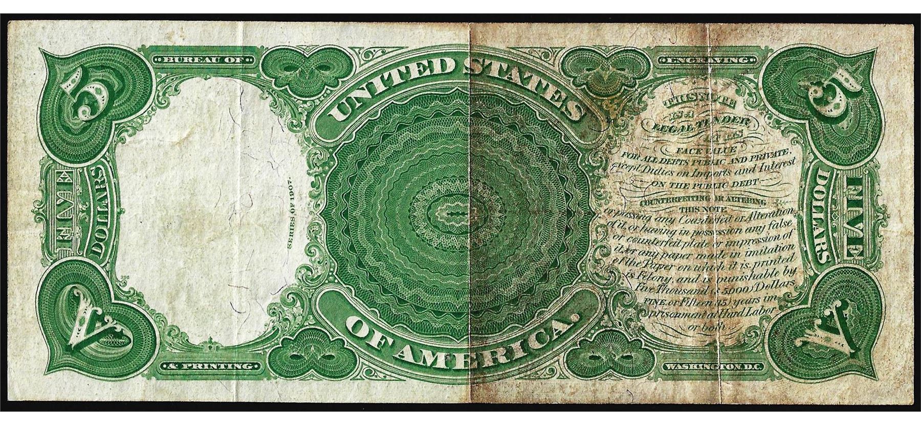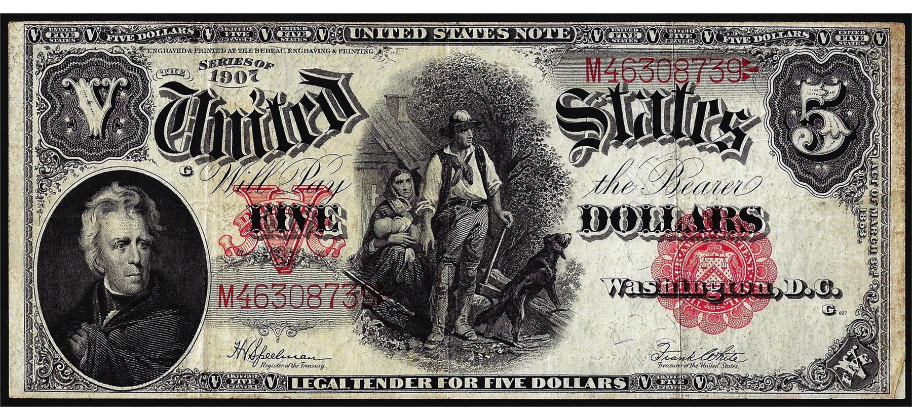 One 1907 $5 Woodchopper Legal Tender Note.