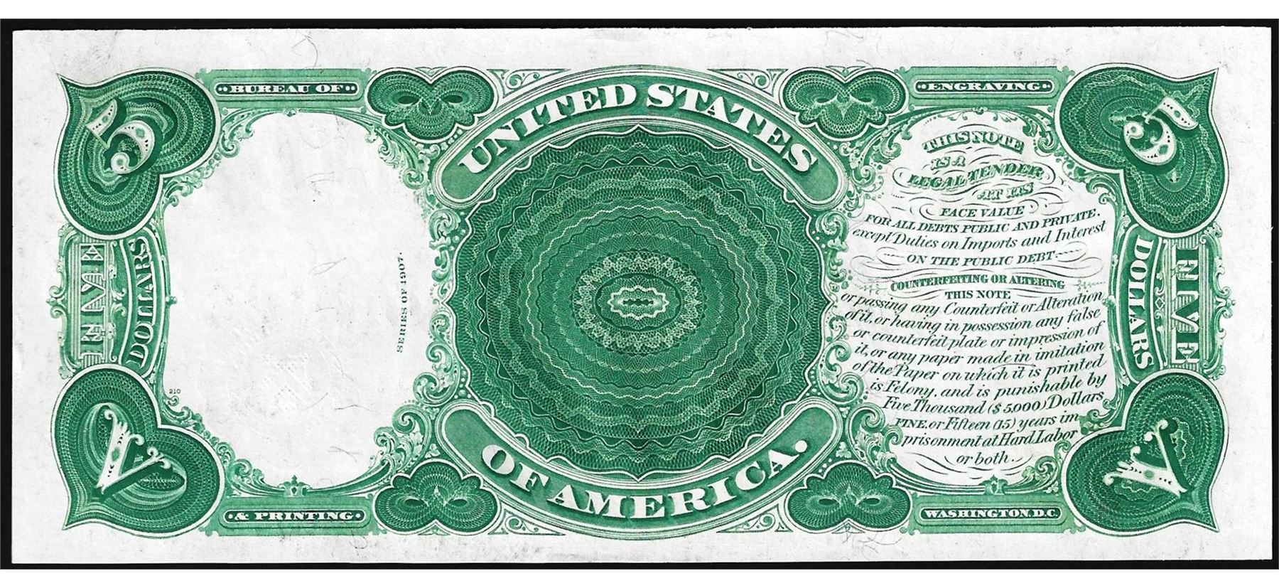 One 1907 $5 Woodchopper Legal Tender Note.