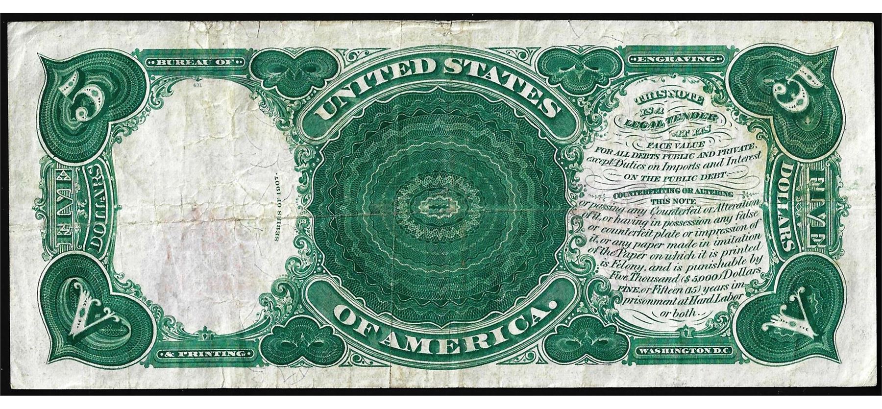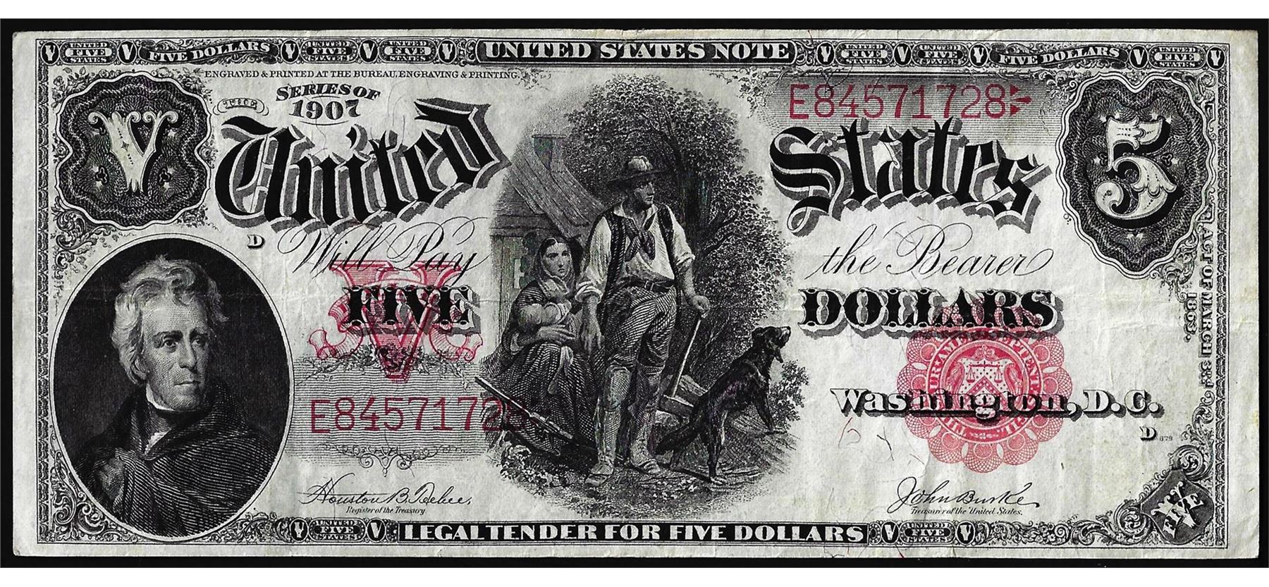 One 1907 $5 Woodchopper Legal Tender Note.