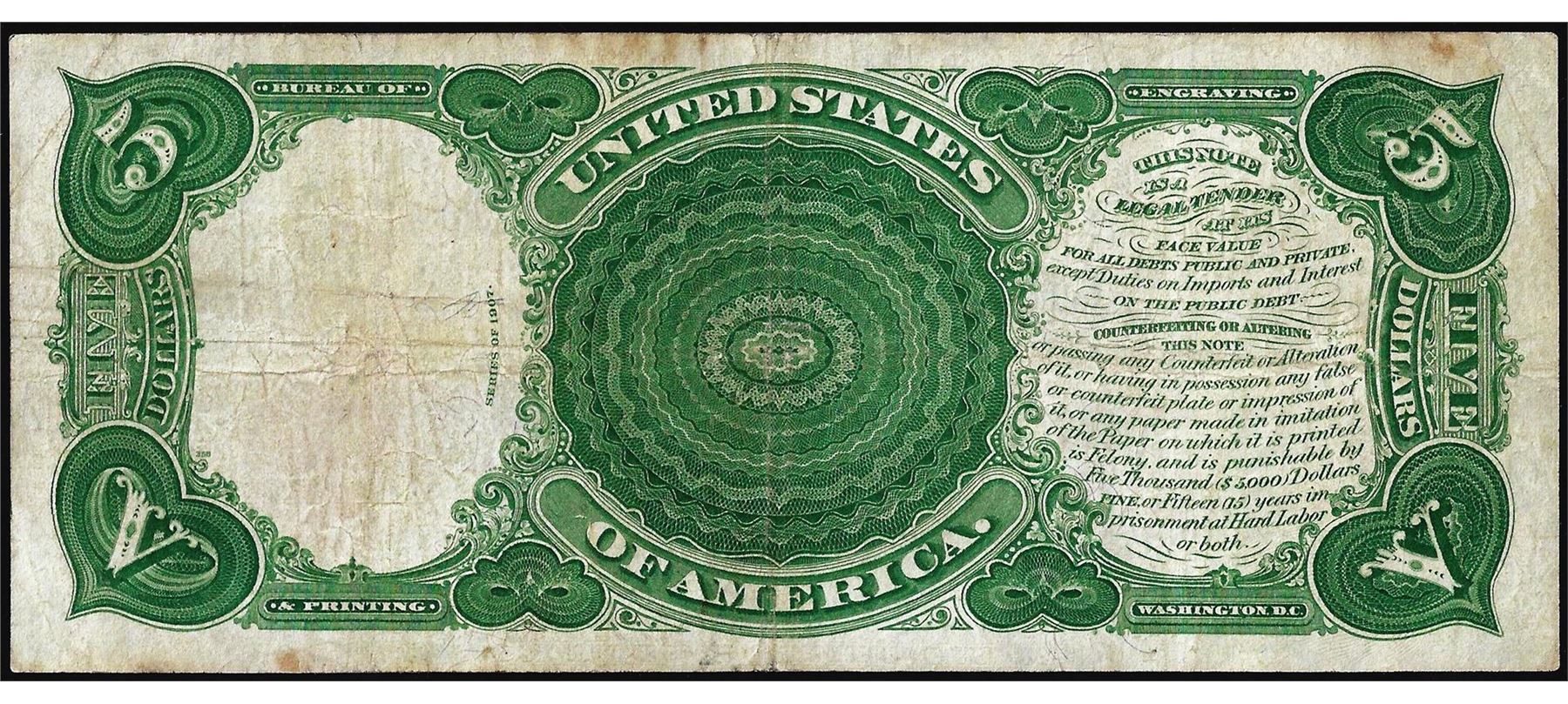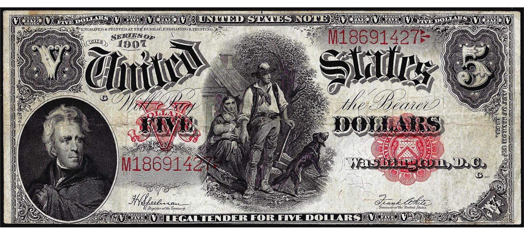 One 1907 $5 Woodchopper Legal Tender Note.