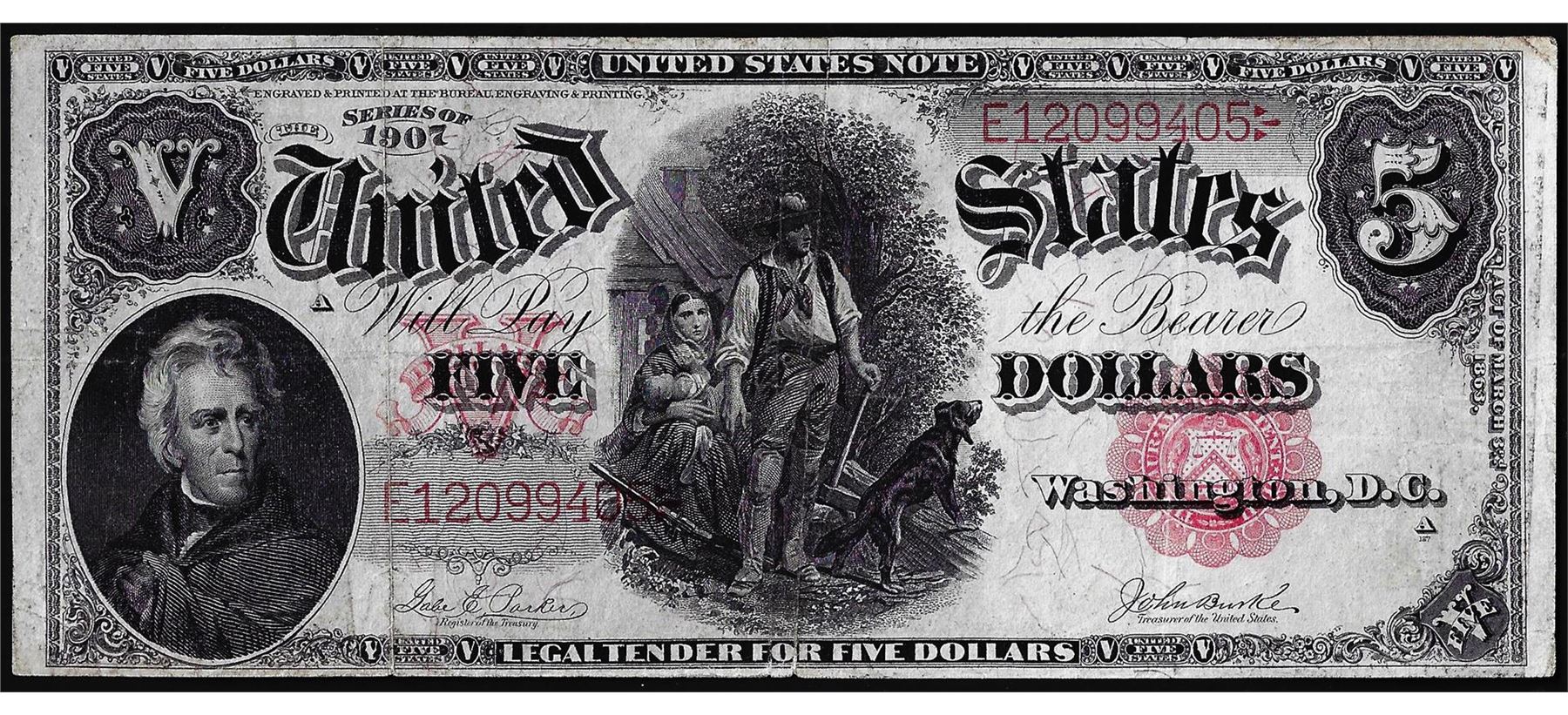 One 1907 $5 Woodchopper Legal Tender Note.