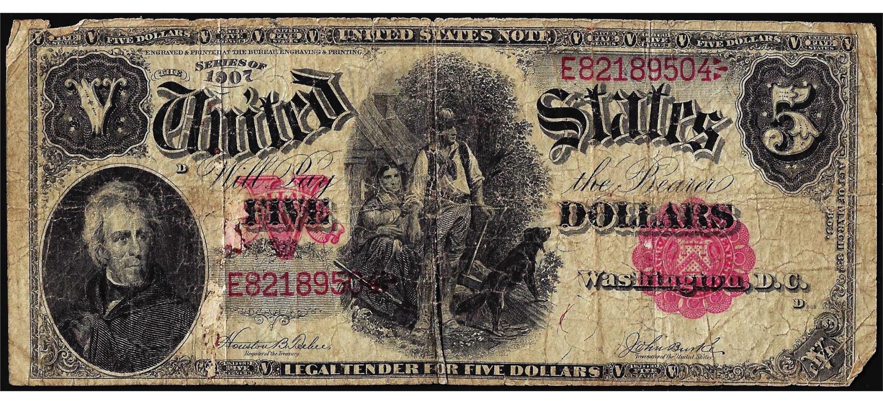 One 1907 $5 Woodchopper Legal Tender Note.