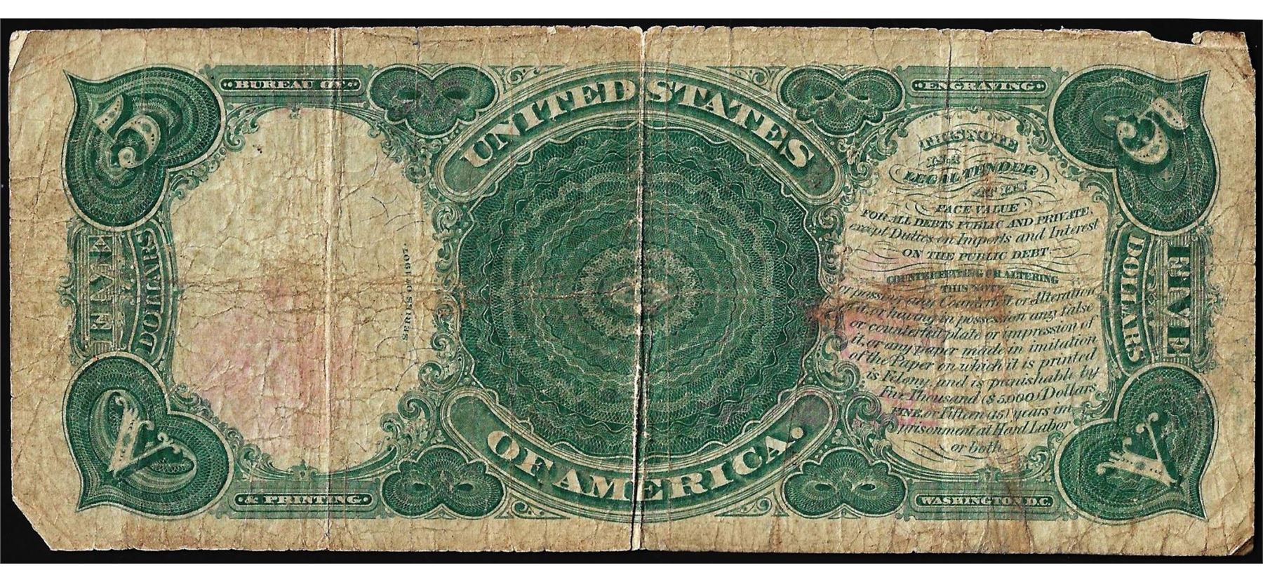 One 1907 $5 Woodchopper Legal Tender Note.