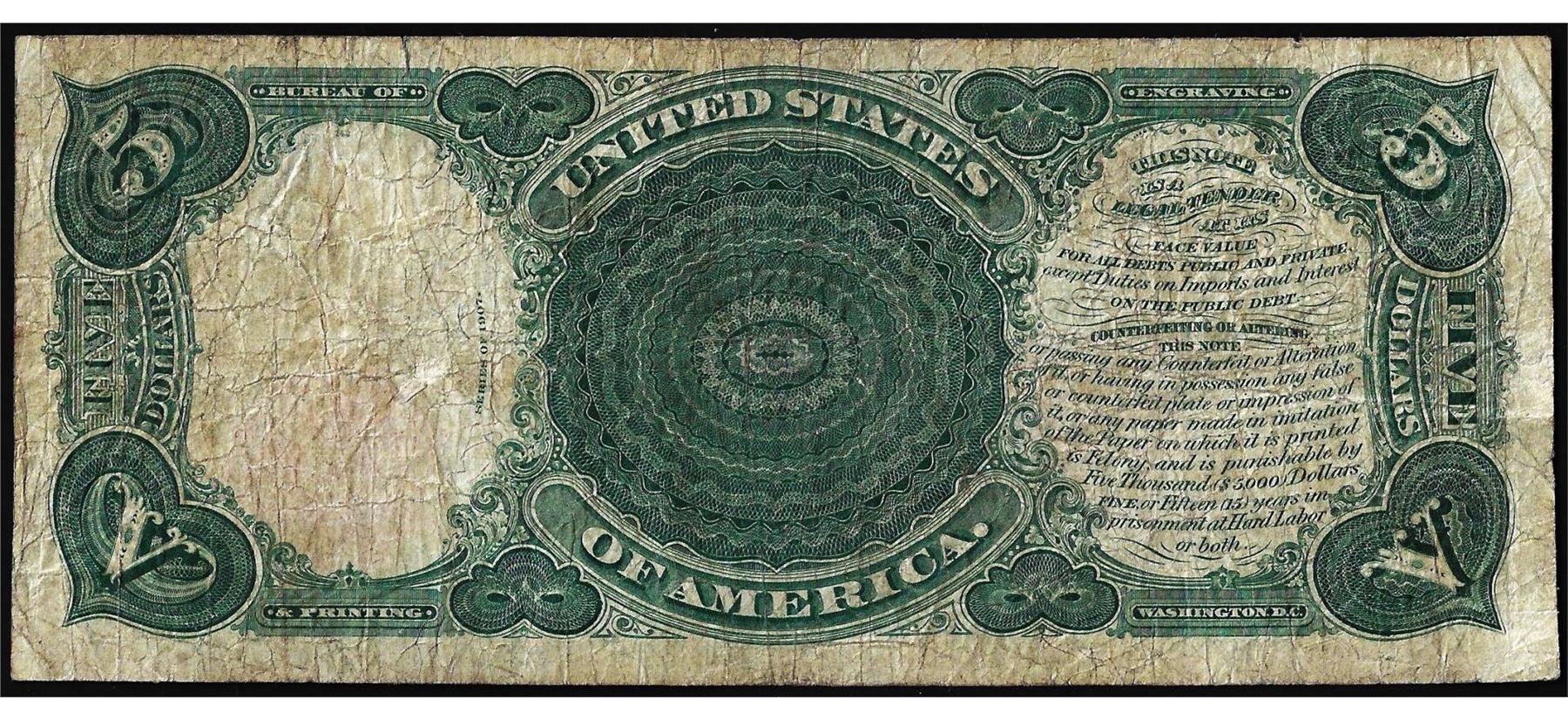 One 1907 $5 Woodchopper Legal Tender Note.