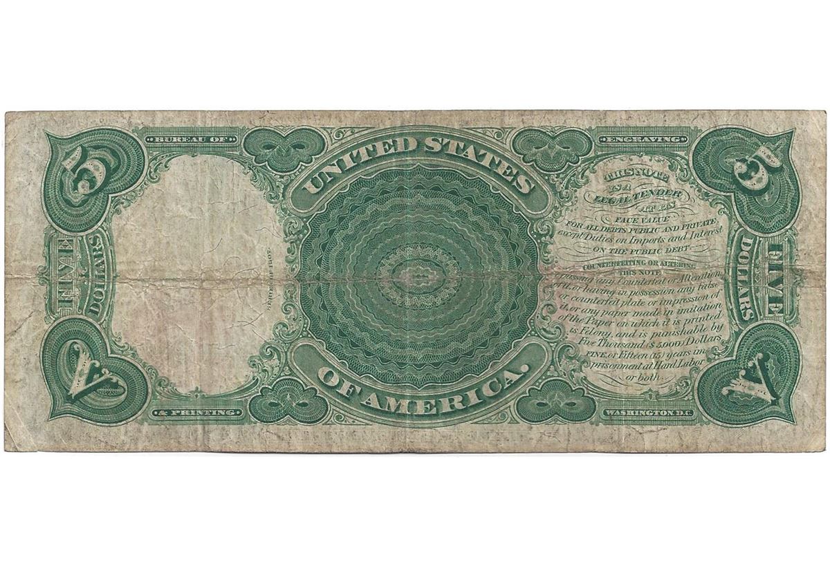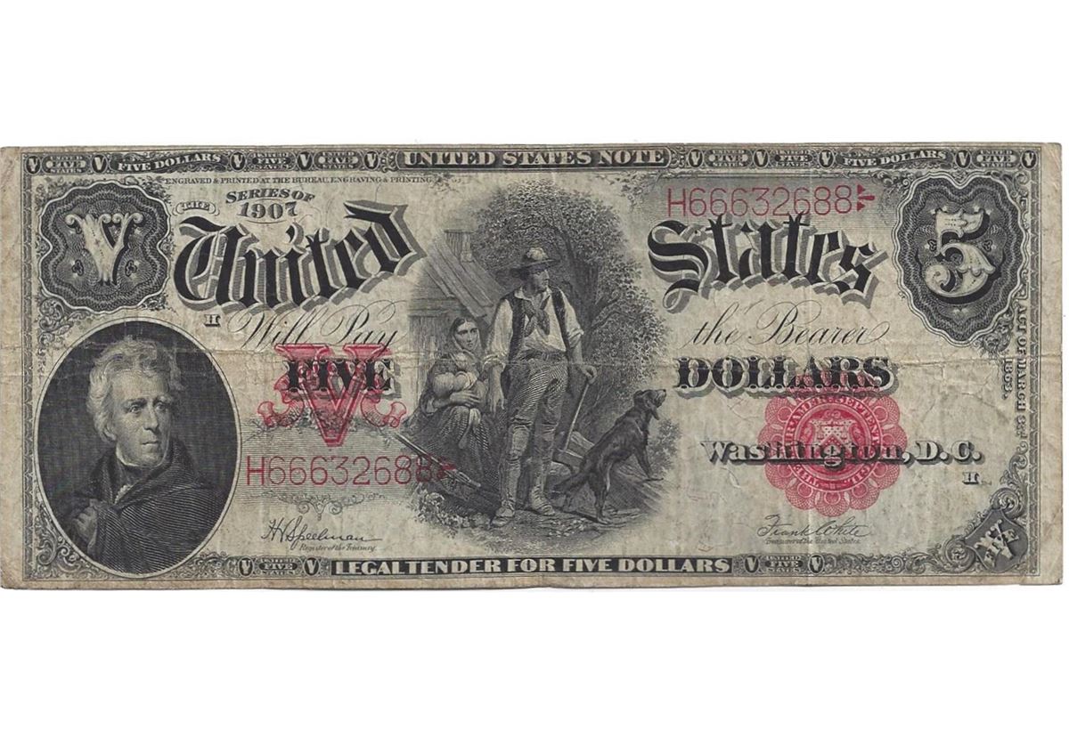 One 1907 $5 Woodchopper" United States Legal Tender Note.