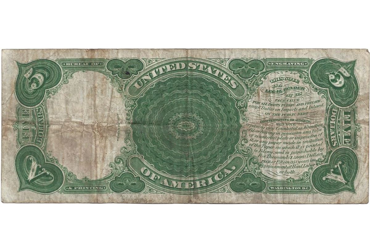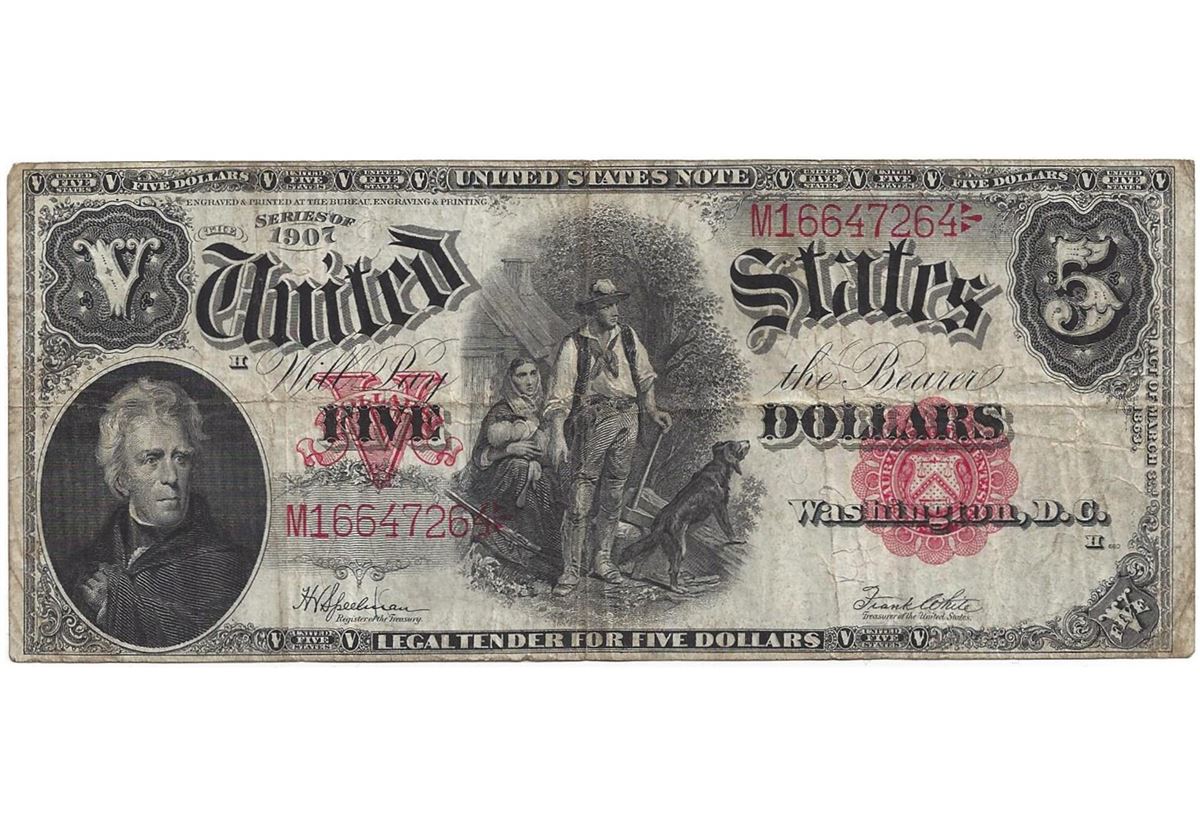 One 1907 $5 Woodchopper" United States Legal Tender Note.