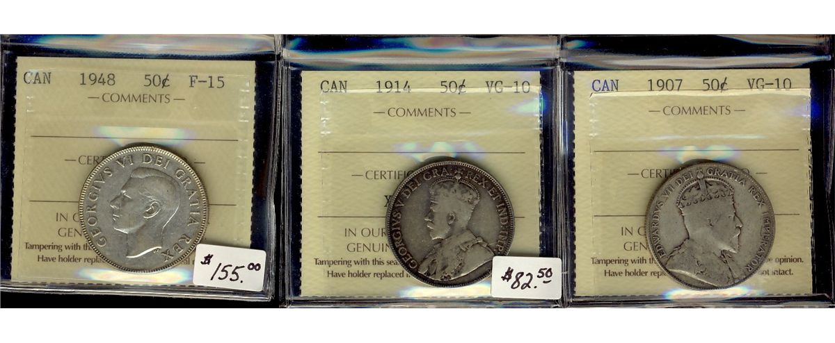 1907 50¢, 1914 VG10 & 1948 ICCS VG10 to F15. Lot of 3 coins.