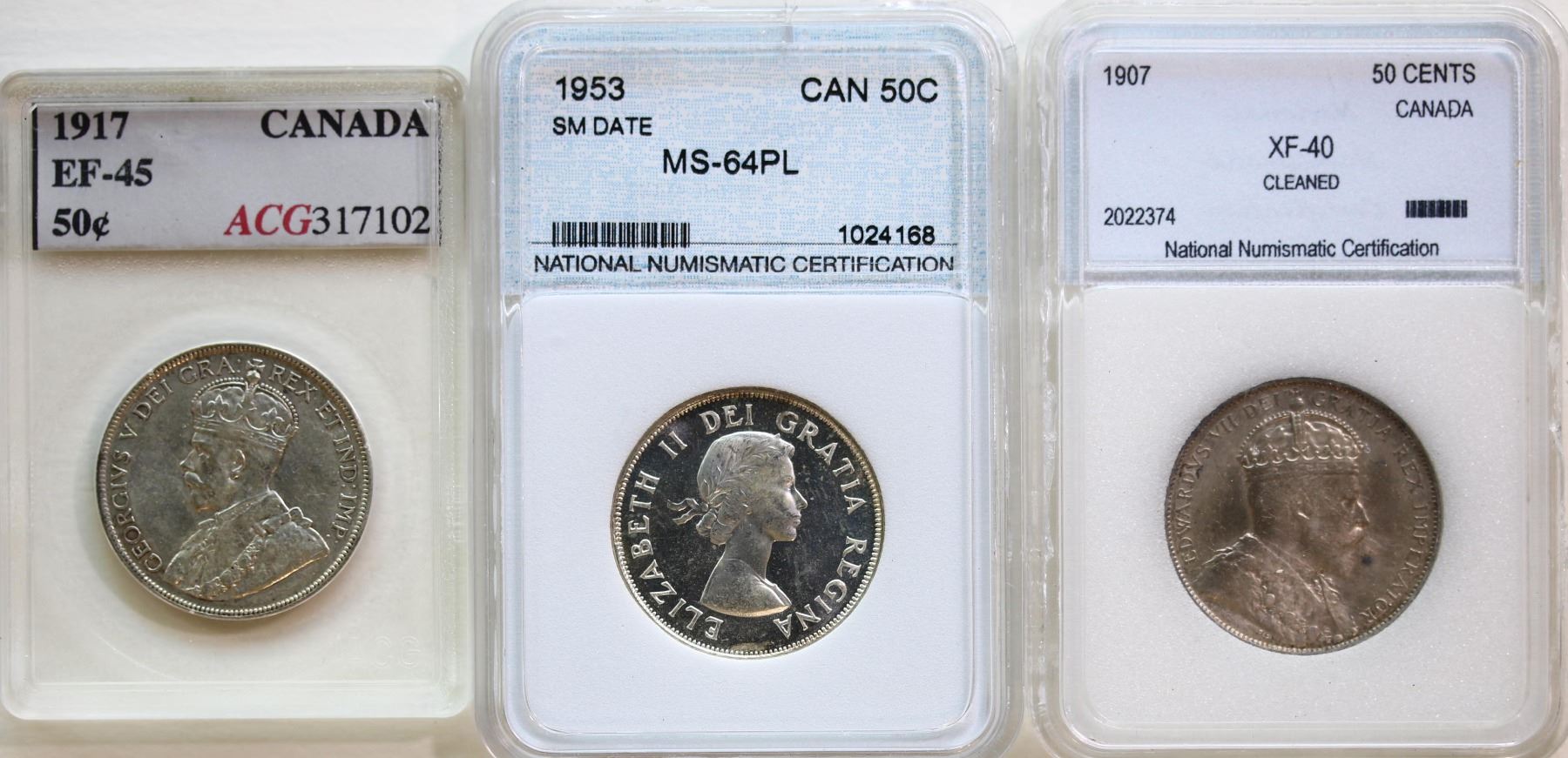 1907 50¢ Cleaned, 1917, 1953 "Small Date". Lot of 3 coins certified Extra Fine-40 to Choice Mint State-64PL